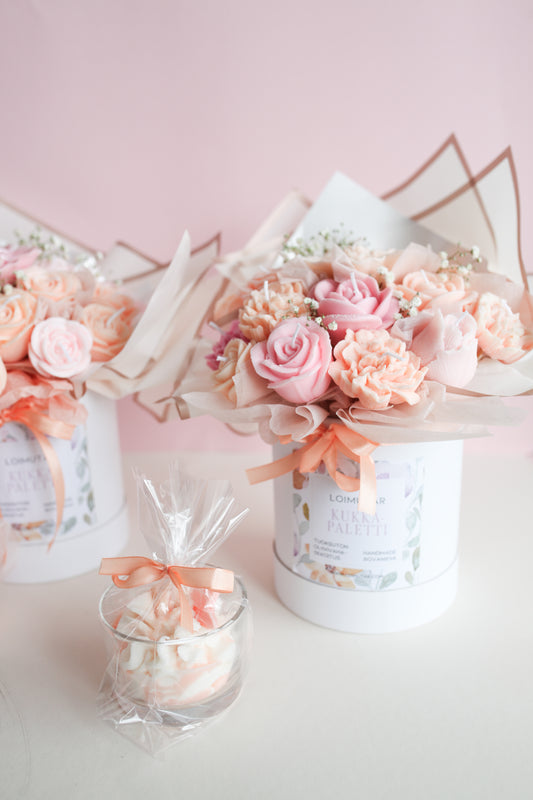 Taittelen huolella valmistetun hentoon silkkipaperiin ja solmin pienen rusetin valmiin merkiksi. Tässä hetkessä on muutakin kuin kynttilä ja paketti; läsnä on myös lohtu ja ilo, taakse jäänyt ja edessä oleva. Kynttilöissämme on käärittynä kaipuu ja paketoituna toivo - läsnäolon lempeä loimu. Sytytä käsintehty kynttilä ja anna pohjoisen luonnon koskettaa.