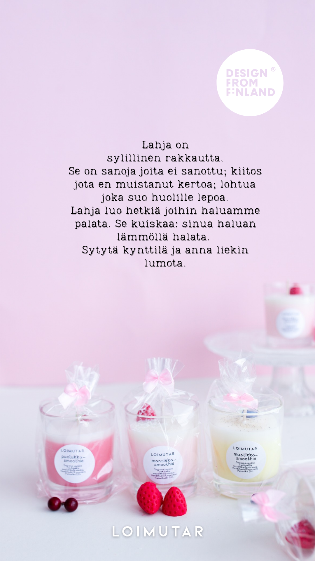 LOIMUTAR on designkynttiläbrändi, jonka kotipaikka on Rovaniemellä. Valmistamme käsityönä luonnonvahakynttilöitä ja ripustettavia huonetuoksuja. Inspiraationamme on Lapin puhdas luonto ja herkulliset jälkiruoat. Tuotteillamme on Design from Finland -merkki takeena laadusta ja visuaalisesta panostuksesta.