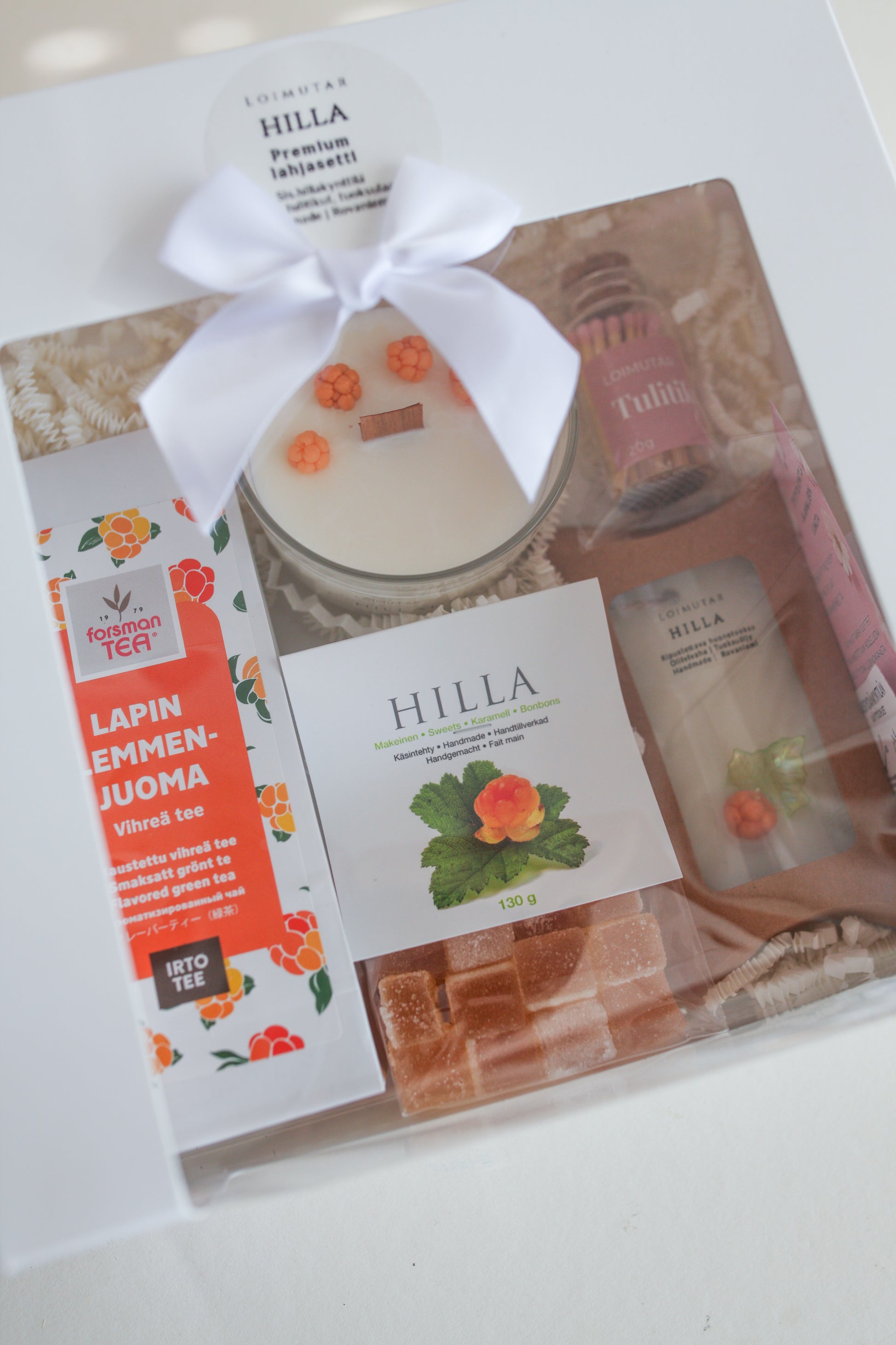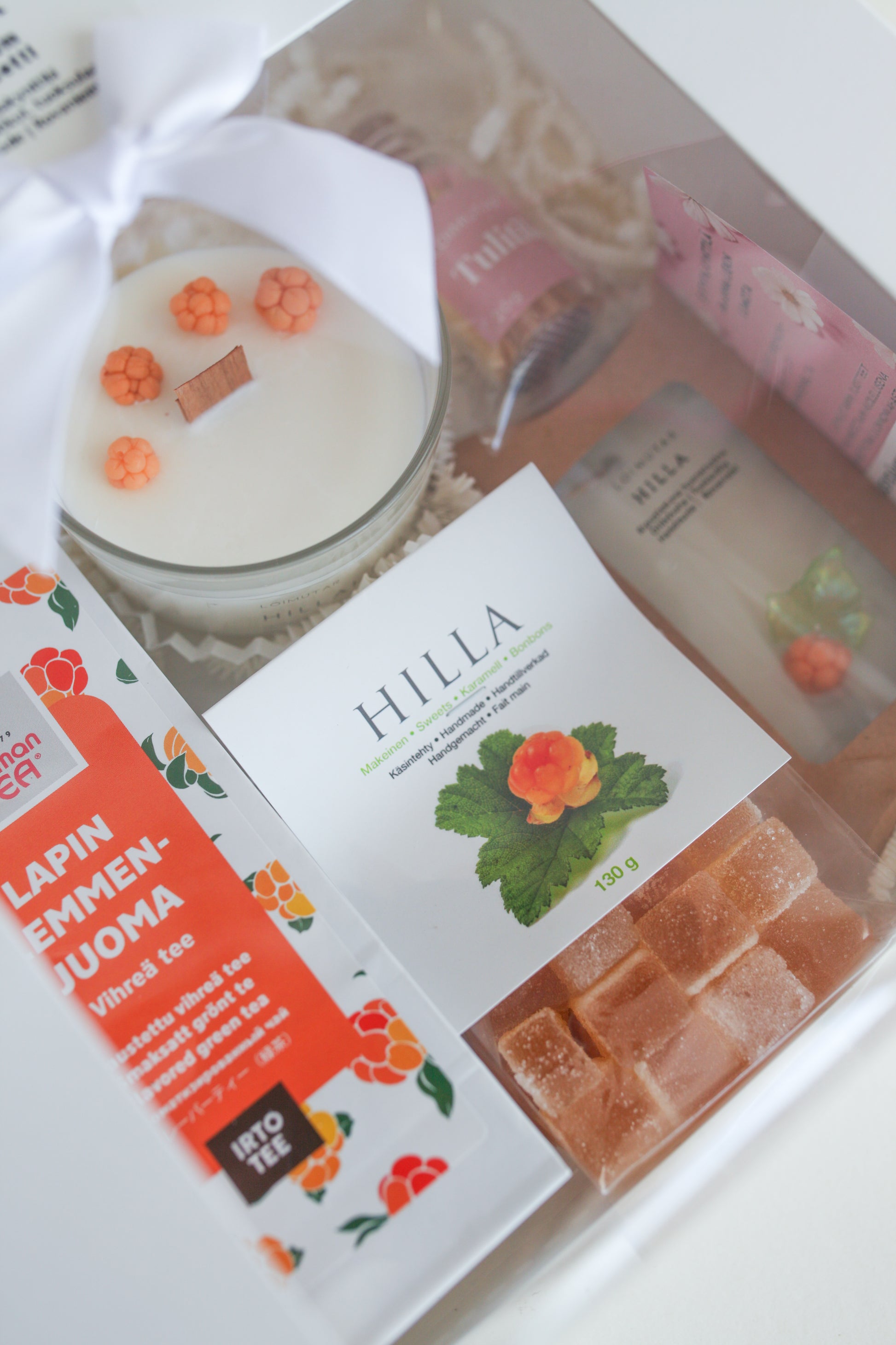 Diese wunderschöne Premium-Geschenkbox enthält sorgfältig ausgewählte finnische Produkte, deren Schwerpunkt, die Moltebeere, ist. Die wunderschön aufeinander abgestimmten Geschenke sind in einer weißen Geschenkbox mit Fenster verpackt. Das Set enthält