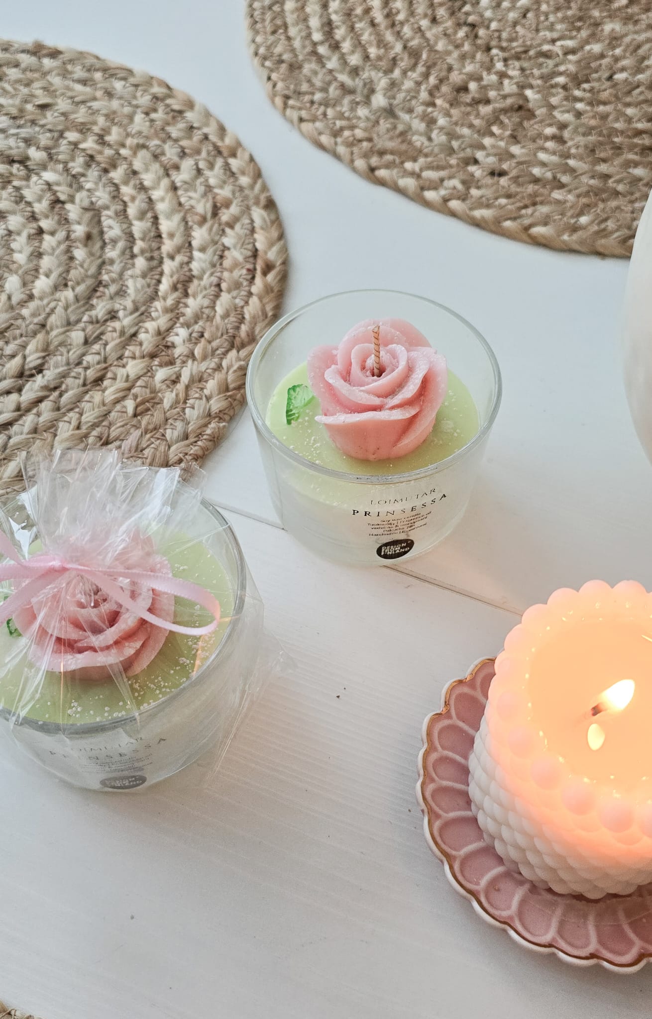 This glass-cast layered candle has a marzipan-scented pink rose on the surface, which is like a marzipan decoration from a real cake! The light green marzipan layer hides a raspberry layer inside, which enchants with the scent of real raspberries. The trick to the candle is that the scent changes as the candle burns. This irresistibly delicious candle is perfect for the princess in your life at the party table and to delight a sweet tooth. Burning time 28-30 hours.