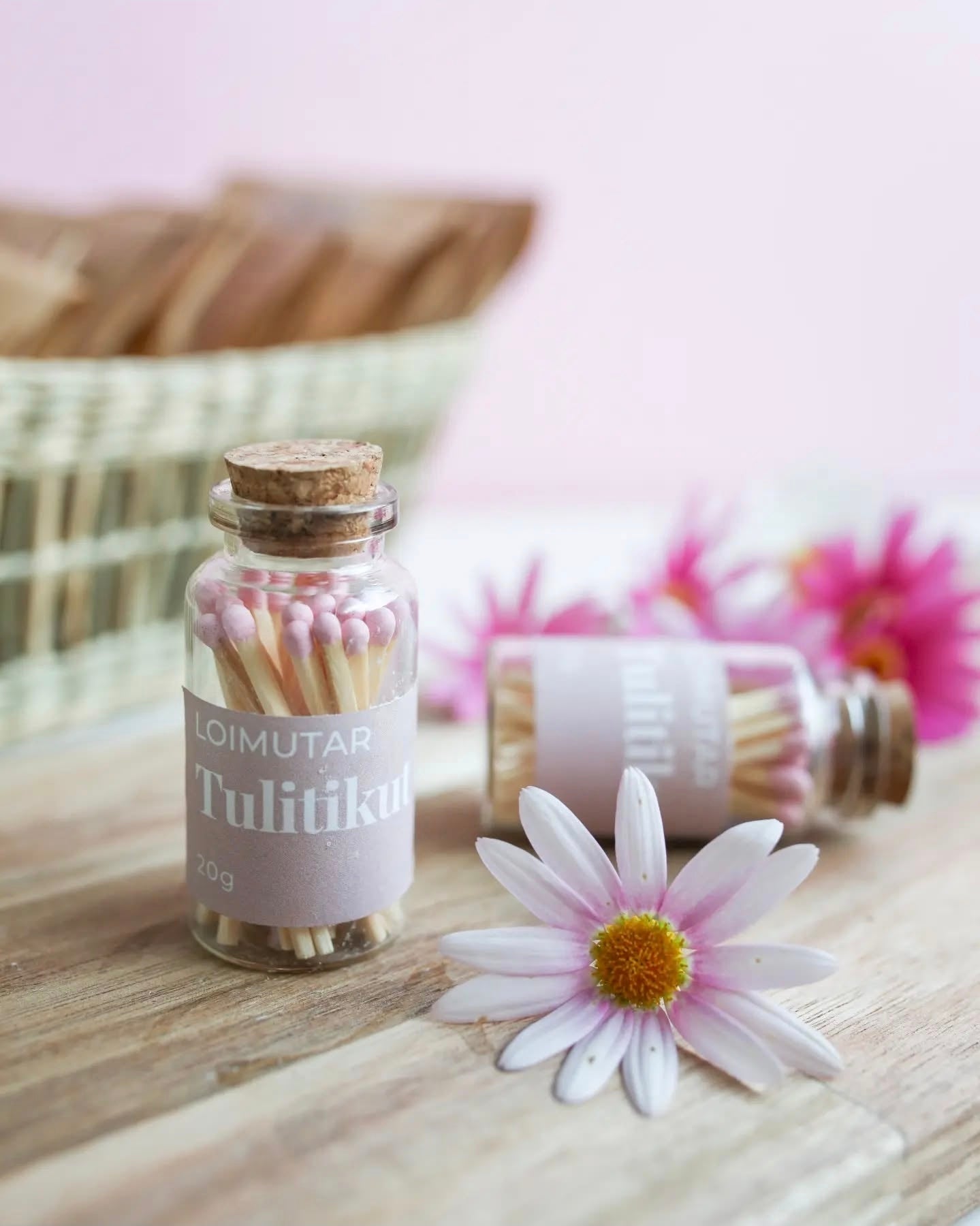 Complete your candle order with adorable pink matches! Loimuttare's pink matches in a glass bottle are perfect for an atmospheric candle ceremony and, thanks to their cute appearance, they can be left on the table next to the candle. Light the candle and let the flame enchant you!