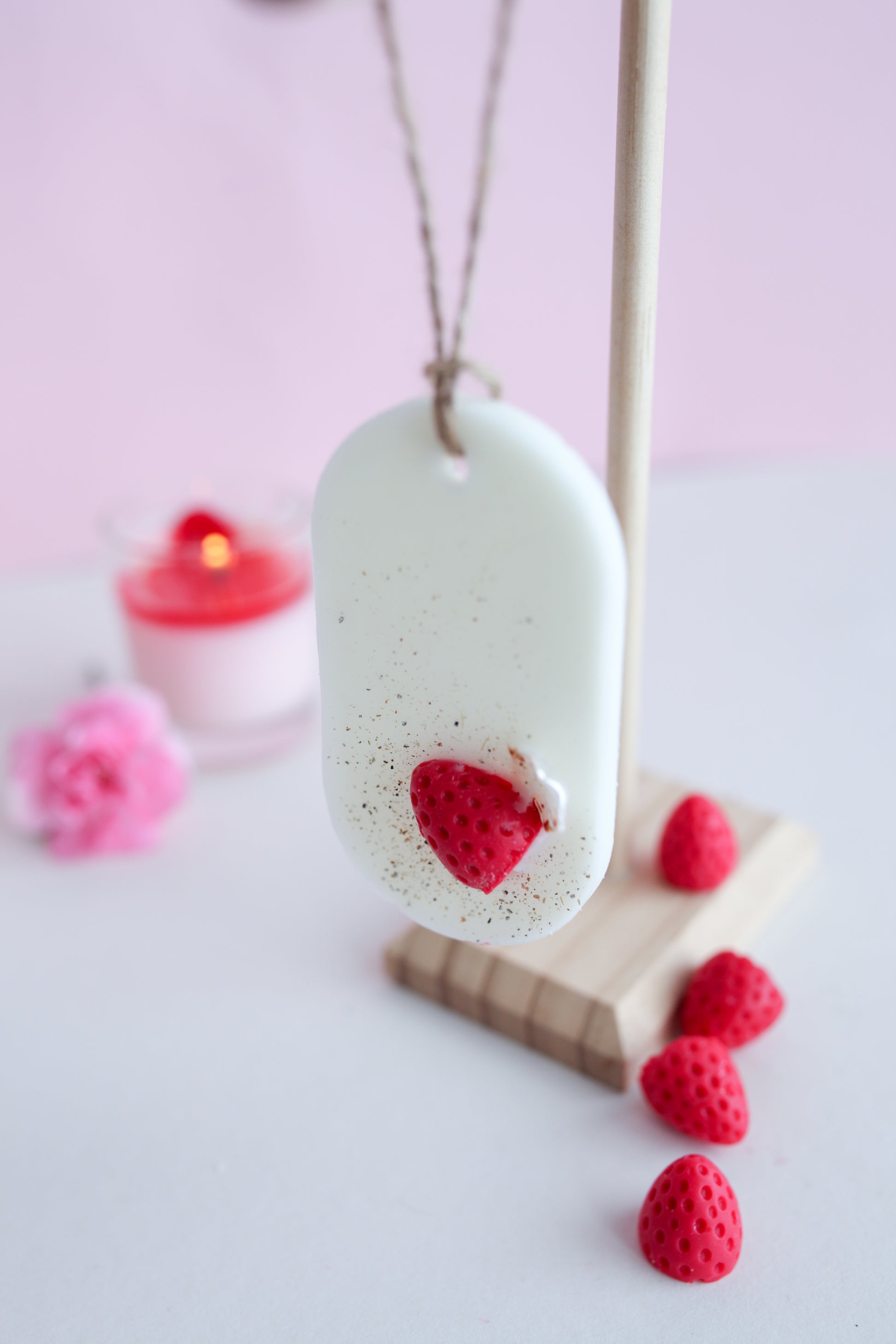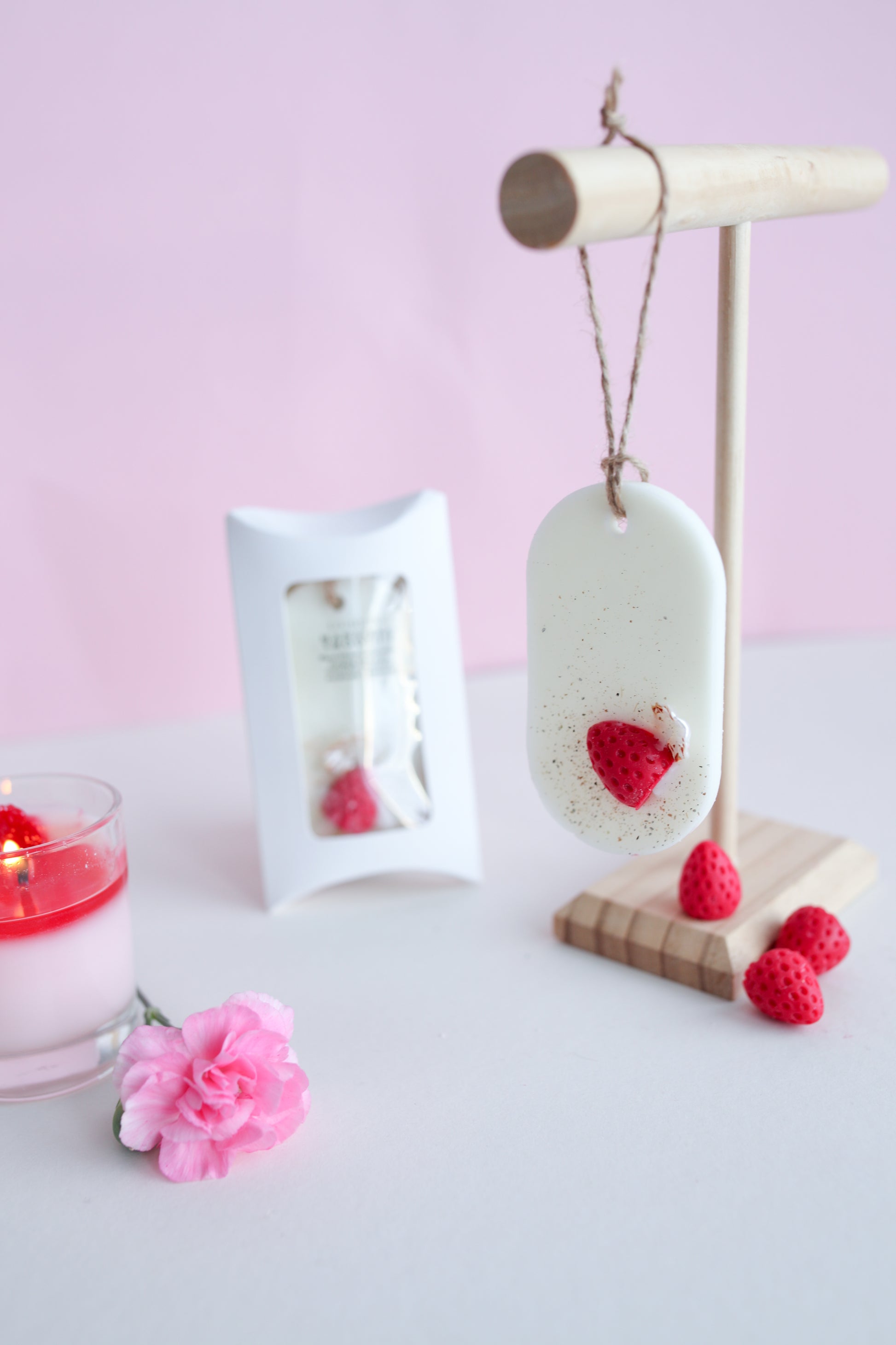 Ripusta tuoksulaatta roikkumaan vessan pyyhekoukkuun, vaatekaappiin tai eteiseen ja anna tuoksun herätellä sinut lempeään päivään. Tuoksulaatassa on koristeena vahasta tehty mansikka ja rapaprerin koristelehti.