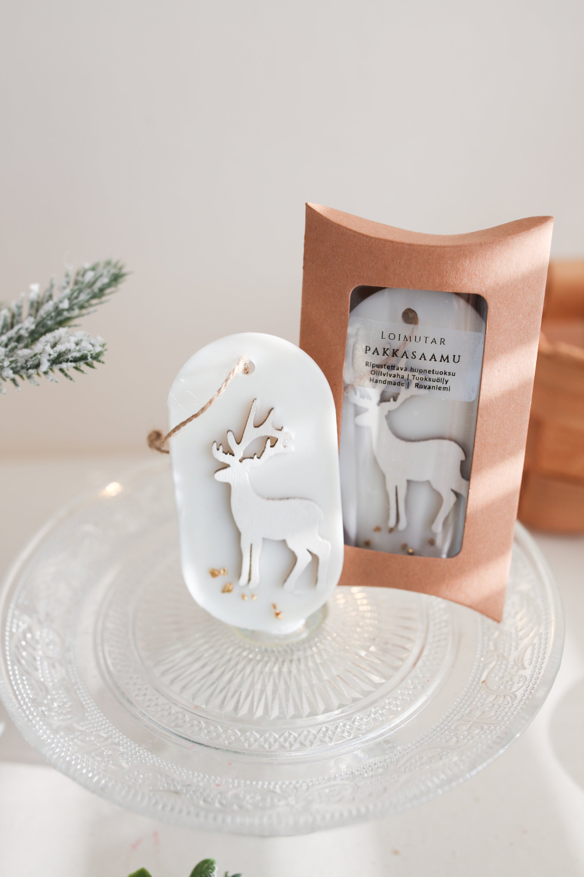 Ripusta pakkasaamun tuoksuinen tuoksulaatta roikkumaan vessan pyyhekoukkuun, vaatekaappiin tai eteiseen ja anna tuoksun herätellä sinut uuteen päivään. Pakkasaamussa tuoksu raikas sekoitus vaniljaa, bergamottia, punaisia omenoita, patsulia, santelipuuta, myskiä ja valkoisia liljoja. Koristeena koivuvanerista tehty poro.