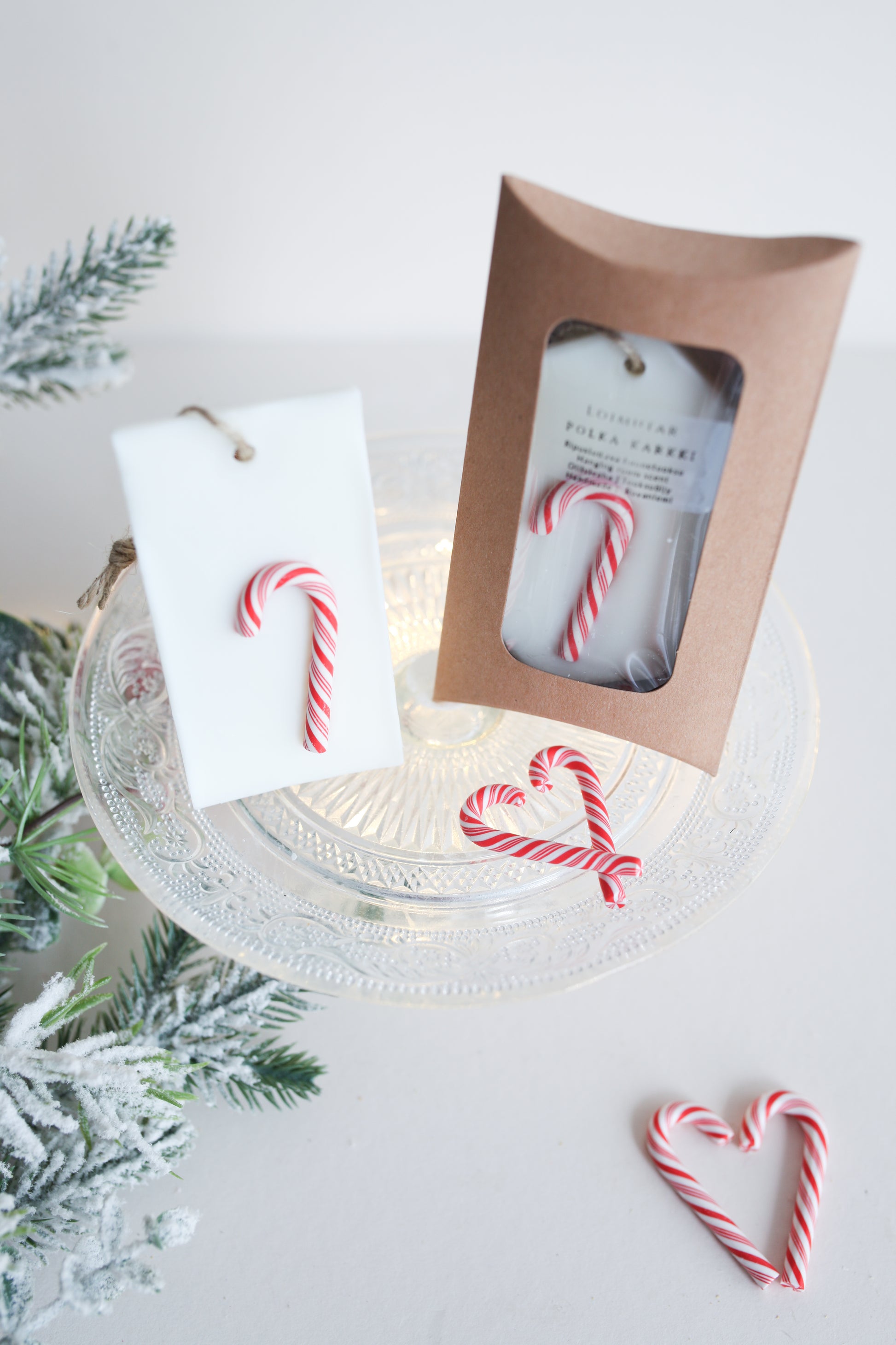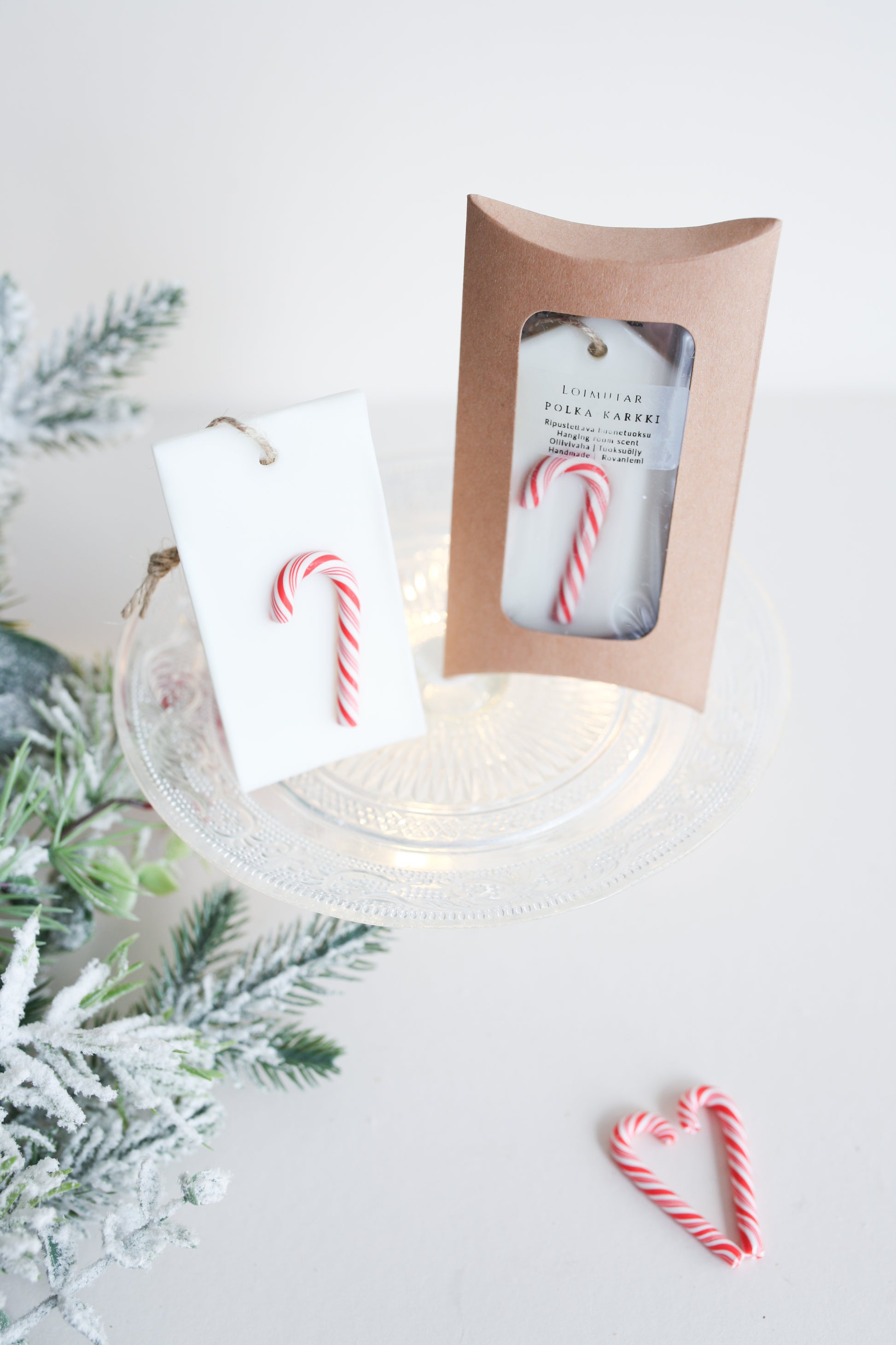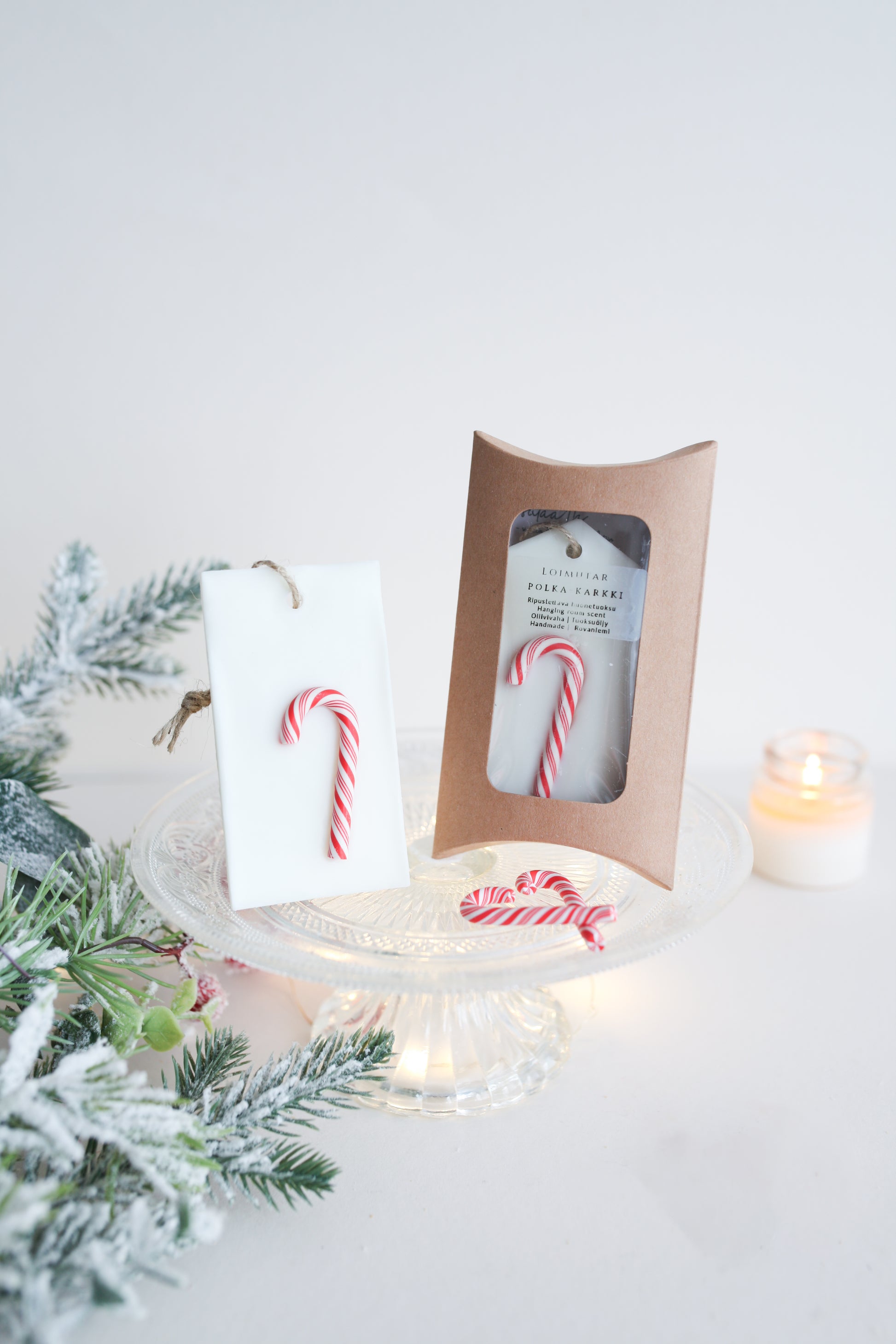 Ripusta polka-karkin tuoksuinen tuoksulaatta roikkumaan vessan pyyhekoukkuun, vaatekaappiin tai eteiseen ja anna tuoksun valloittaa! Polka tuoksuu vaniljaiselta piparminttukarkilta. Tuoksu on pehmeä, herkullinen ja minttuisen viileä. Koristeena punavalkoraidalllinen karkkitanko.