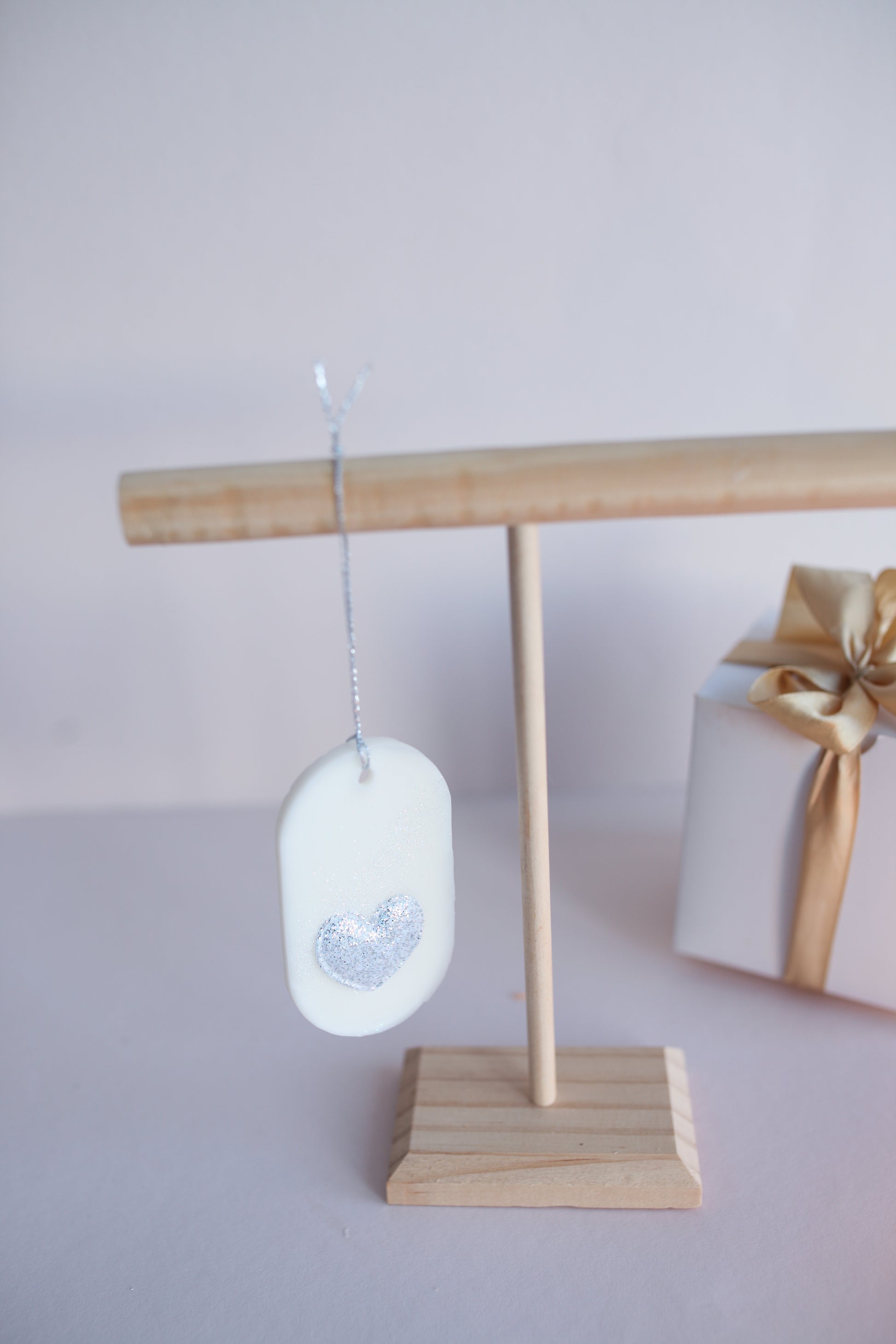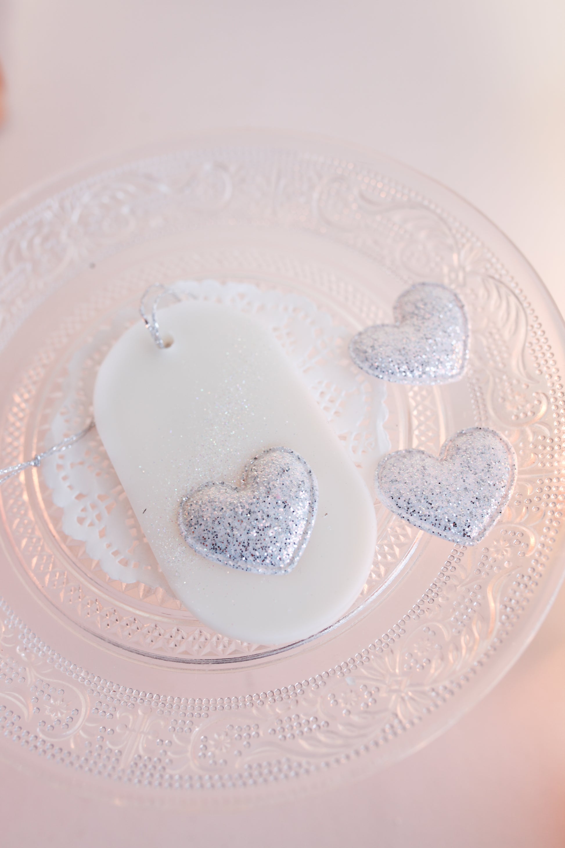Ripusta tuoksulaatta roikkumaan vessan pyyhekoukkuun, vaatekaappiin tai eteiseen ja anna tuoksun herätellä sinut lempeään päivään. Tuoksulaatassa on koristeena glitterillä koristeltu hopeanvärinen sydän.