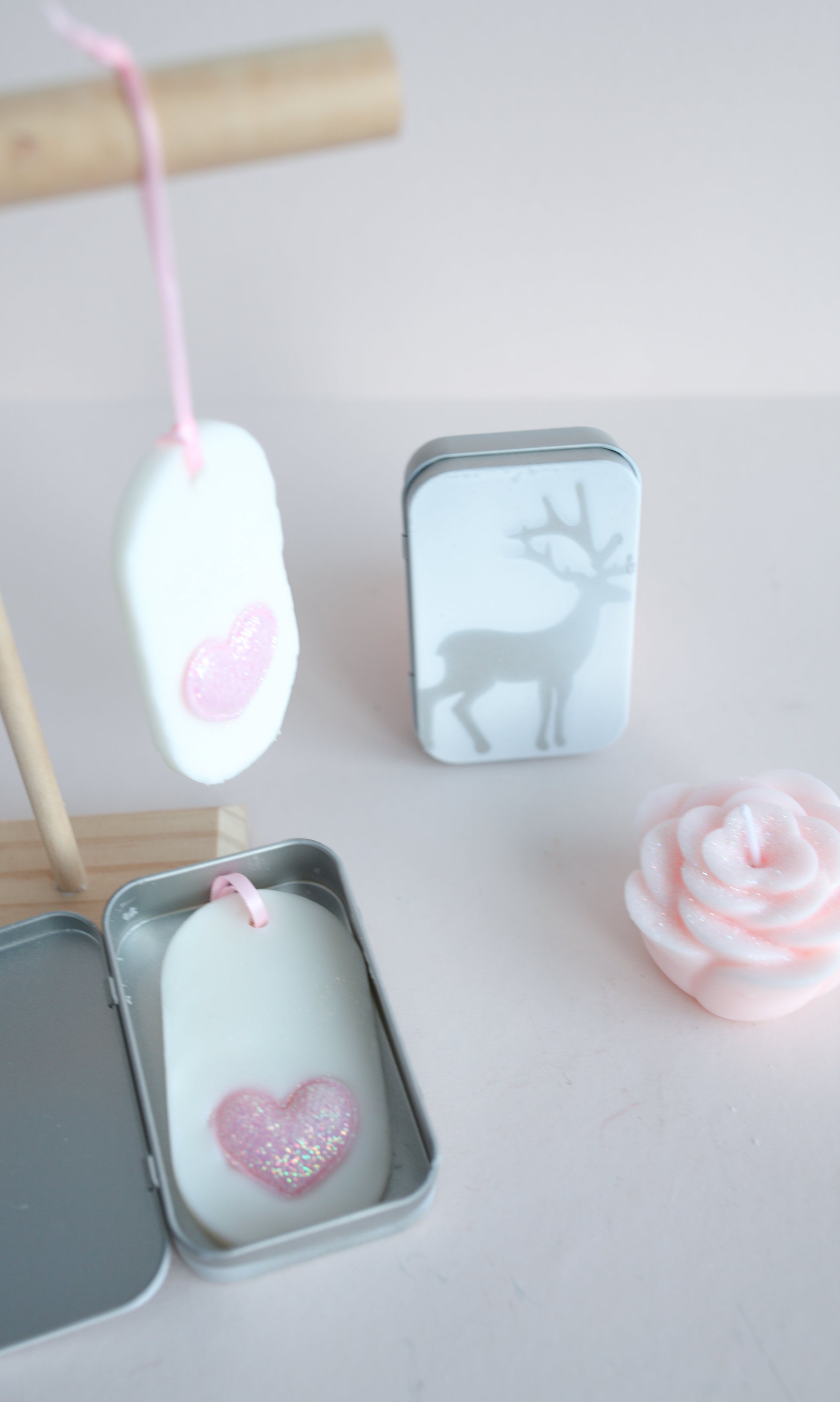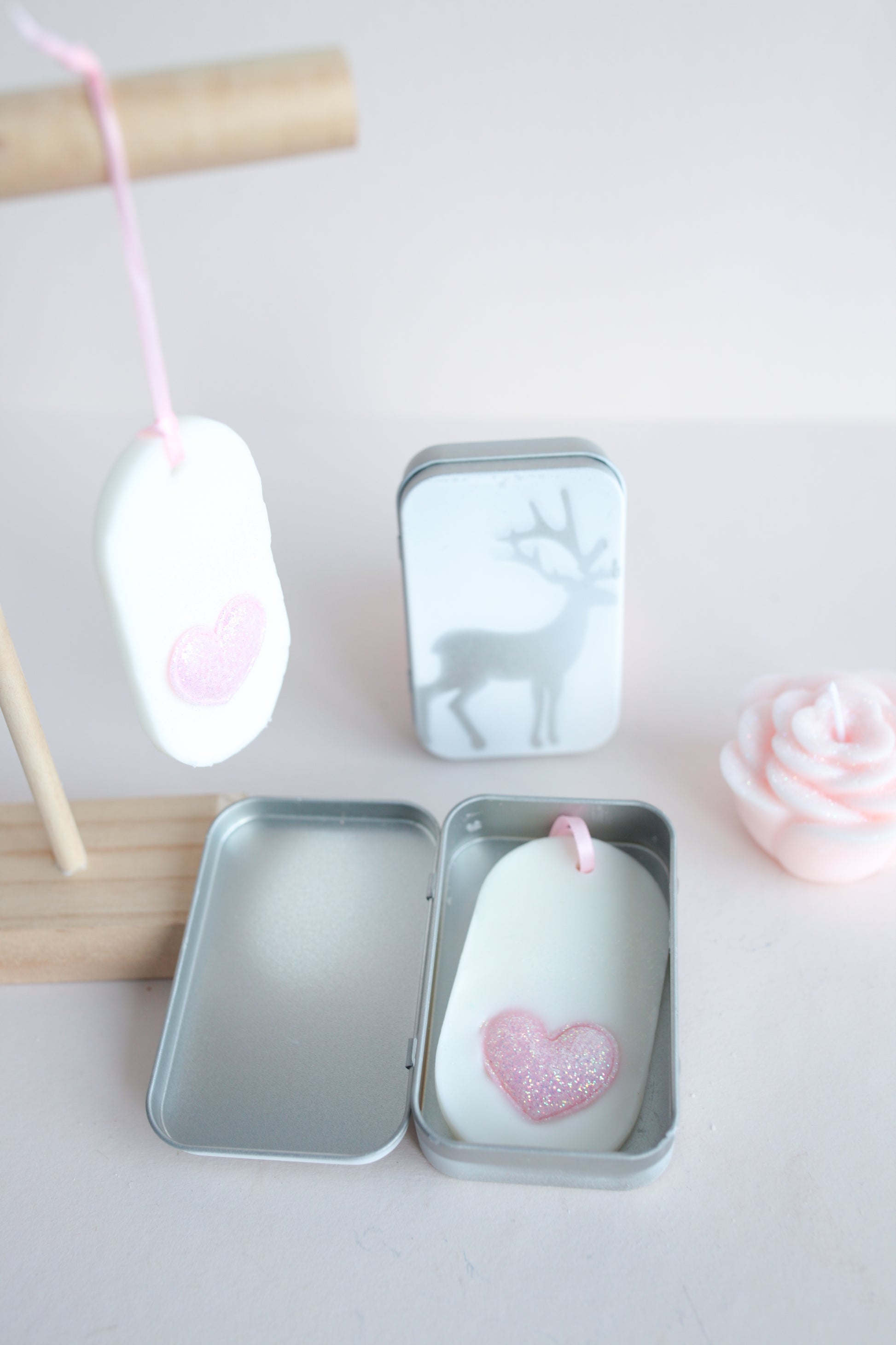 Rasiaan mahtuu yksi Loimuttaren malliston ovaalin tai särmikkään muotoinen ripustettava huonetuoksu. Kannessa on käsin maalattu hopeinen poro.