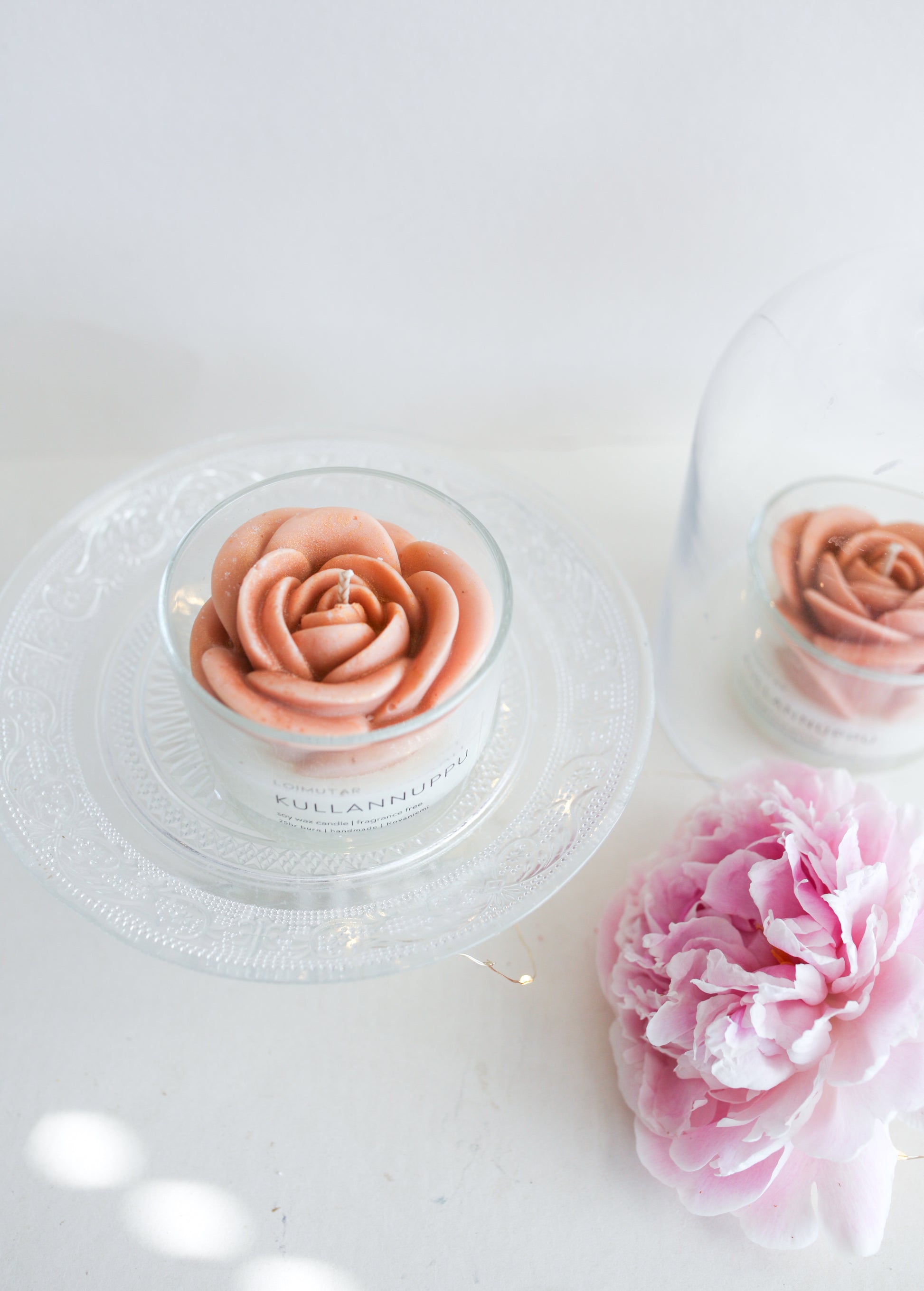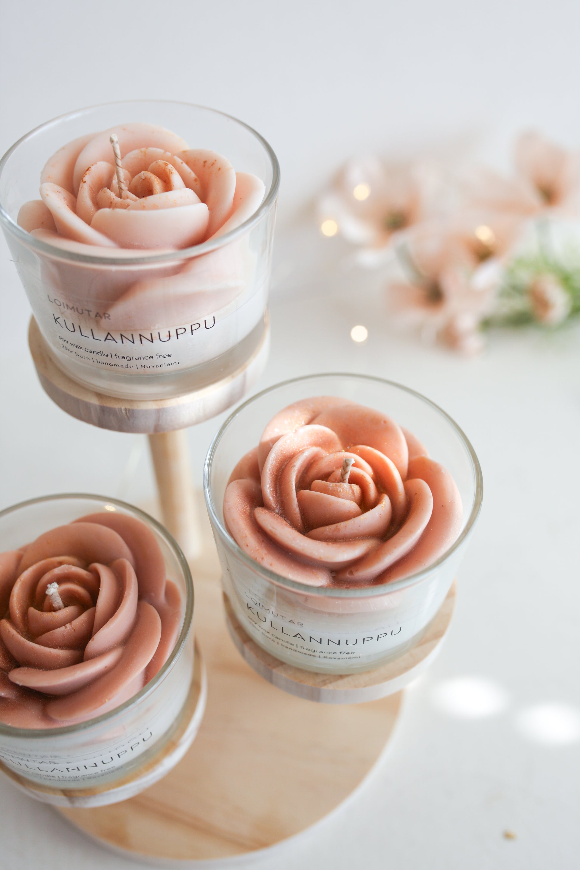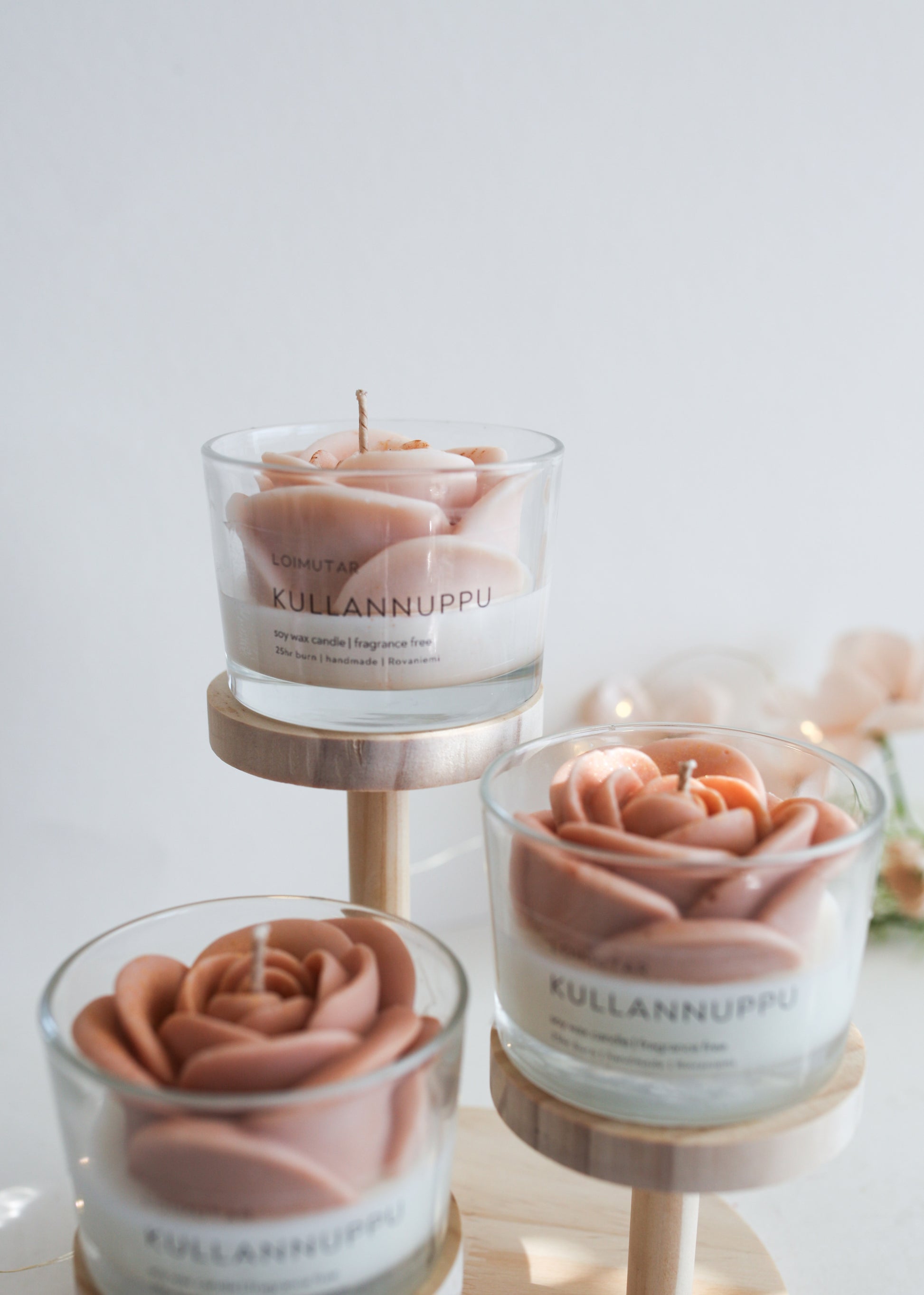 Kullannuppu on lasiin valettu kullanhohtoinen vaalean beige soijavahakynttilä. Tässä ylellisessä kynttilässä on puuvillasydän, joka palaa rauhallisella liekillä pitkään. Valettu puhtaasti palavasta vegaanisesta soija- ja oliivivahasta. Jokainen kynttilä on uniikki ja ruusujen sävy voi aavistuksen vaihdella. Kynttilä on tuoksuton.