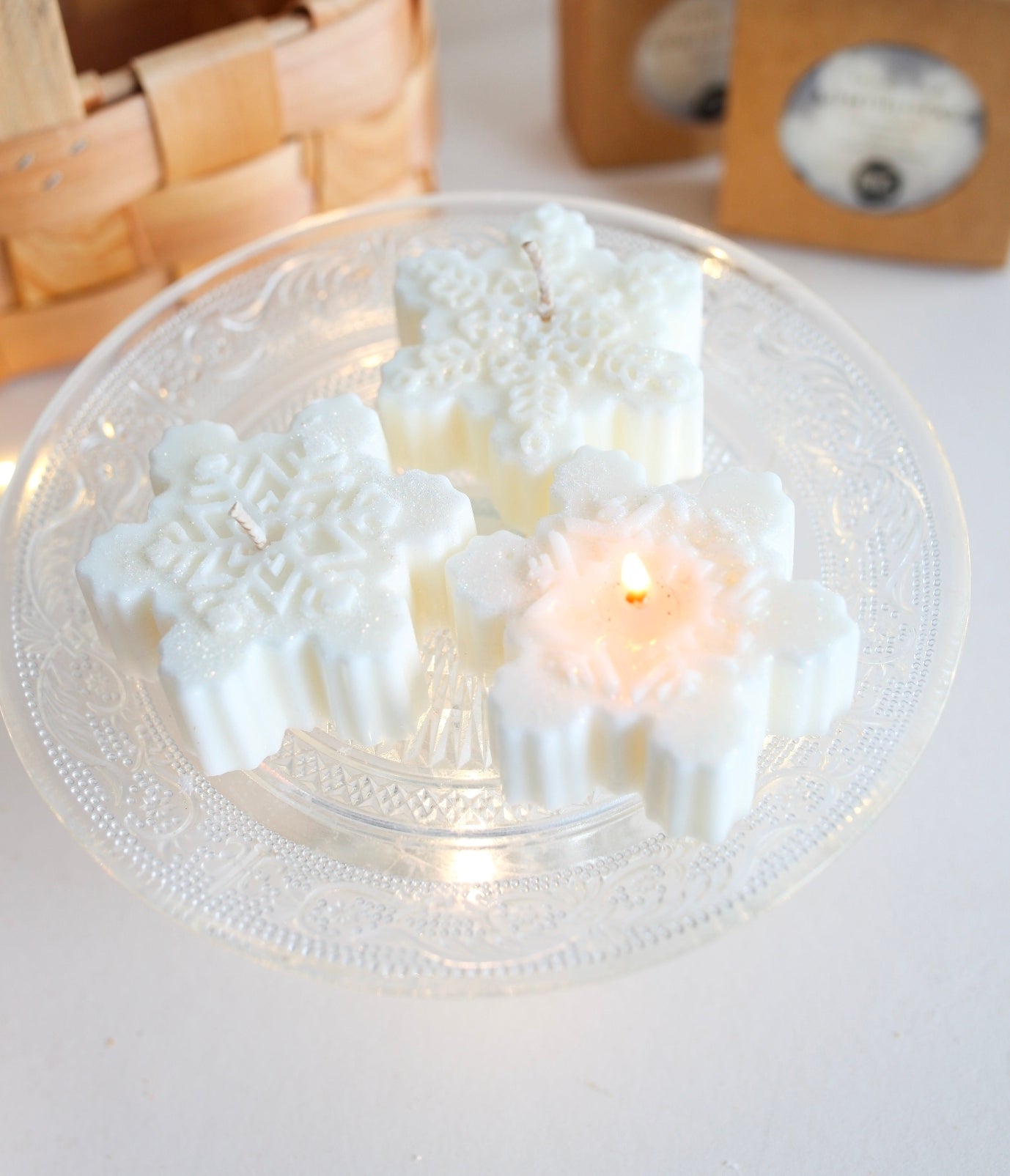 Kaunis valkoinen lumihiutaleen muotoinen soijavahakynttilä pakattuna yhdessä mäntyalusen kanssa. Kynttilän pinnalla on hennosti kimmeltäviä hileitä - kuin ensilumi huurteisessa maassa!