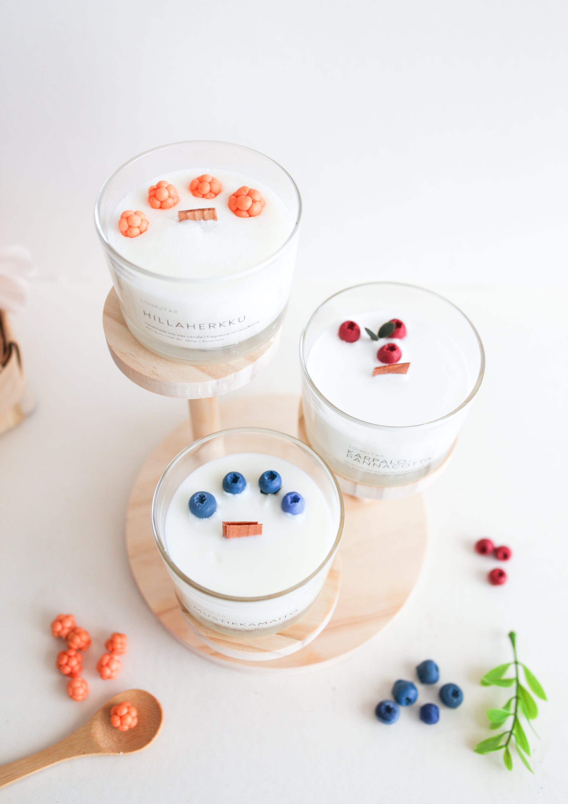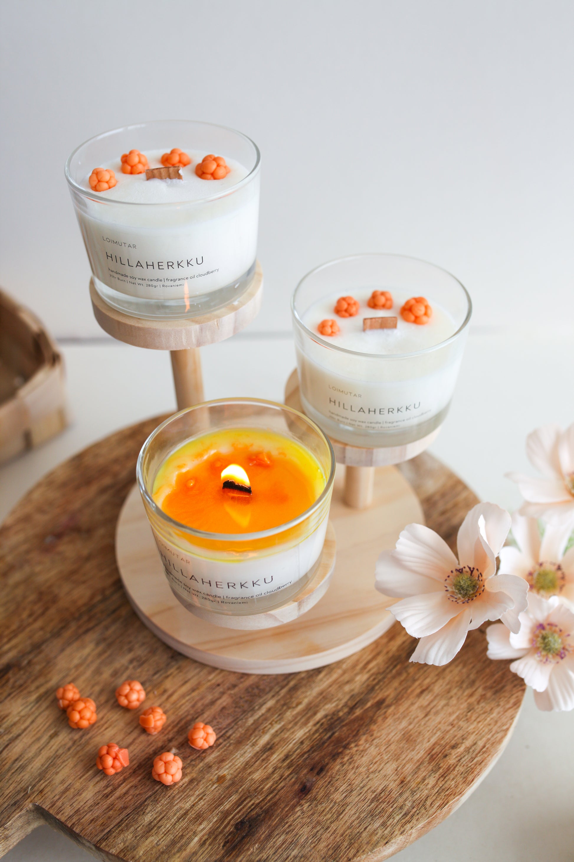 Tämä ainutlaatuinen hillakynttilä on kuin elokuisen auringonlaskun värjäämä taivaanranta! Upea hehkuva väri, rätisevä liekki ja raikkaan makea hillan tuoksu muodostavat ainutlaatuisen tunnelman. Hillan muotoiset marjat sulavat polton aikana muodostaen ihanan kultaisen hillakastikkeen kynttilän pinnalle. Kynttilä on kaunis sellaisenaan ja sopii lahjaksi, tuliaiseksi tai ihan vain tunnelmanluojaksi. Kynttilässä on aito hillamarjojen tuoksu. Valmistettu käsityönä soija- ja oliivivahasta.