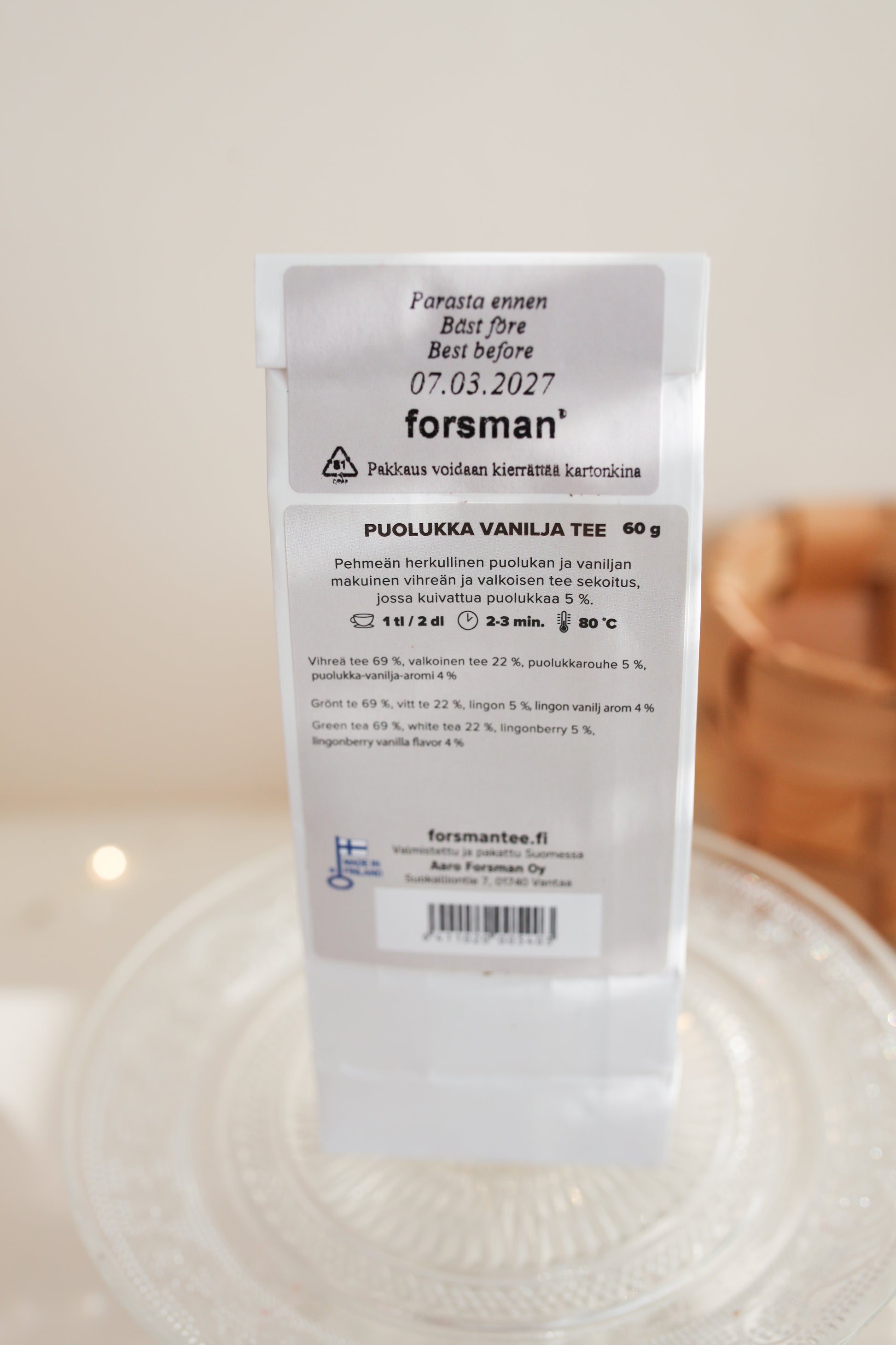 Puolukka-vaniljatee vie ajatuksesi hetkeksi keskelle suomalaista metsämaisemaa. Valkoisen ja vihreän teen sekoitus, jossa yhdistyy luonnon oma puolukka sekä makea vanilja on kokeilemisen arvoinen. Vaniljalla maustettu tee tuoksuukin jo itsessään niin ihanalle, että sitä on vain pakko maistaa!