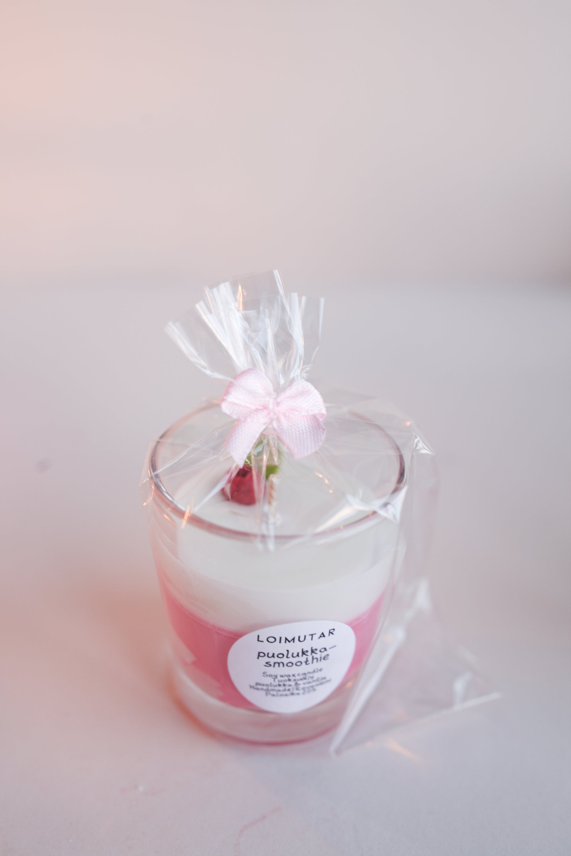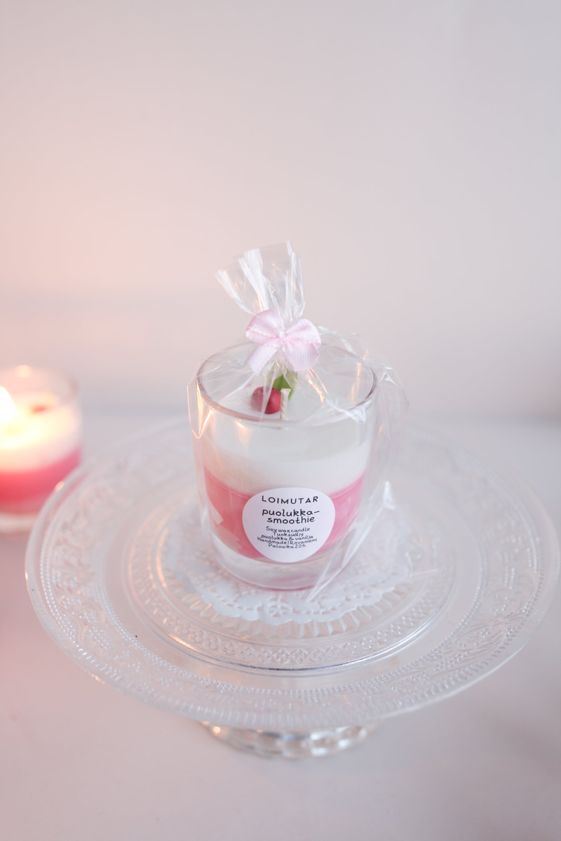 Kynttilä on valettu korkealaatuisesta soijavahasta ja joukkoon on lisätty tuoksuöljyjä. Ei sisällä eläinperäisiä ainesosia eikä parabeenejä. Lasin tilavuus on 9cl. Tuoksussa aistit puolukan, vaniljan sekä puolukkajugurtin tuoksun. Pakattu sellofaaniin rusetin kera.