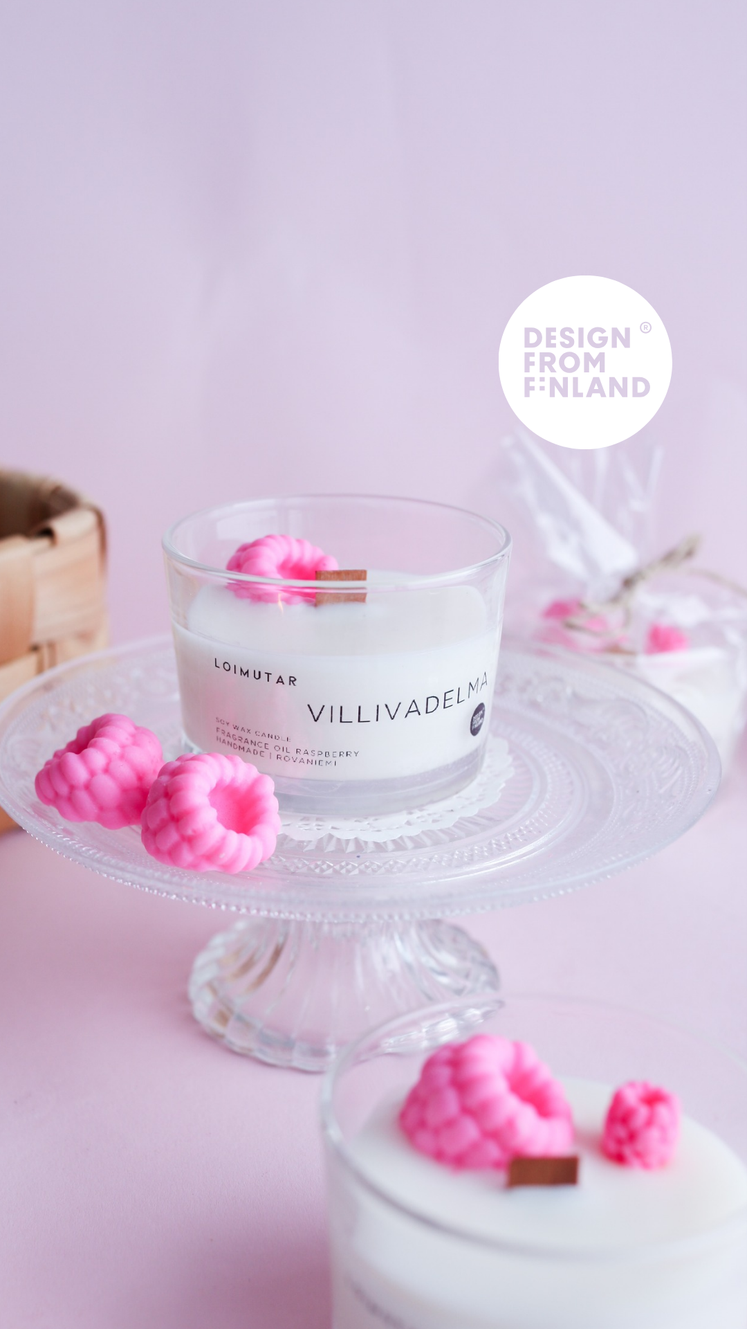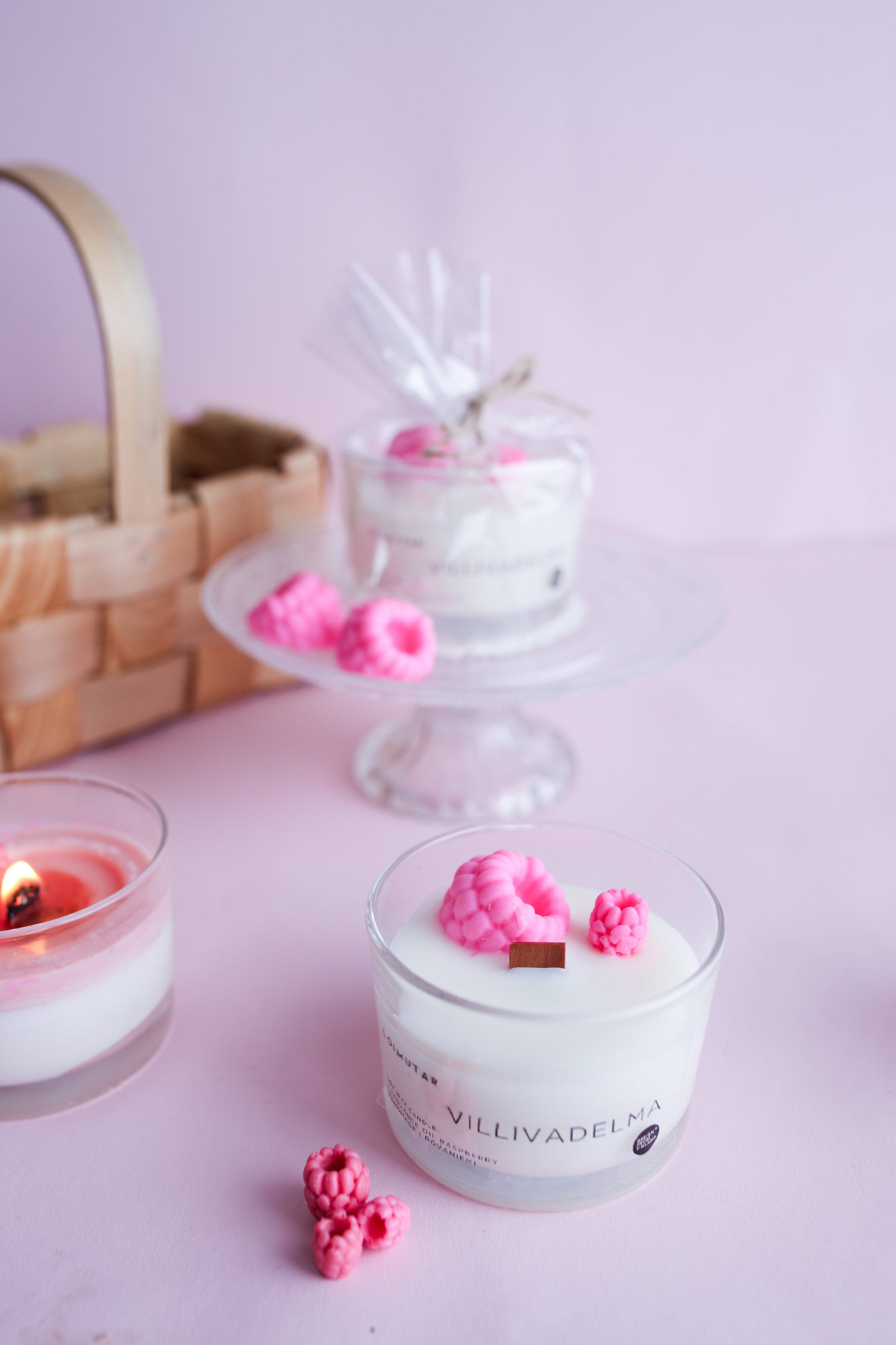 Tämä veikeä vadelmakynttilä on raikas kuin jäätelöannos kuumana kesäpäivänä! Upea pinkki väri, rätisevä liekki ja raikkaan makea vadelmien tuoksu piristää kotiasi ja tuo hymyn huulille. Vadelman muotoiset marjat sulavat polton aikana muodostaen ihanan pinkin vadelmakastikkeen kynttilän pinnalle. Kynttilä on kaunis sellaisenaan ja sopii lahjaksi, tuliaiseksi tai ihan vain tunnelmanluojaksi. Kynttilässä on vadelmajäätelön ja vaniljan tuoksu. Valmistettu käsityönä soija- ja oliivivahasta.