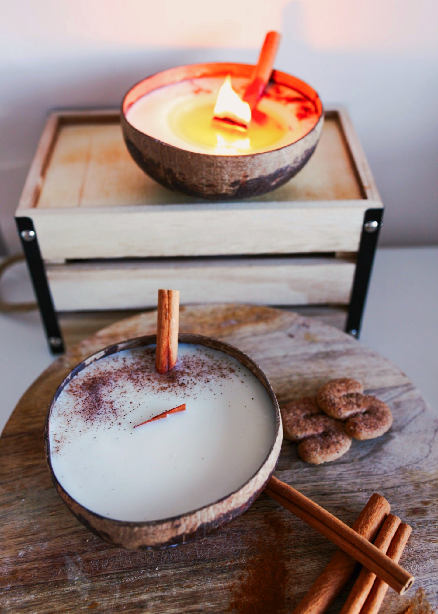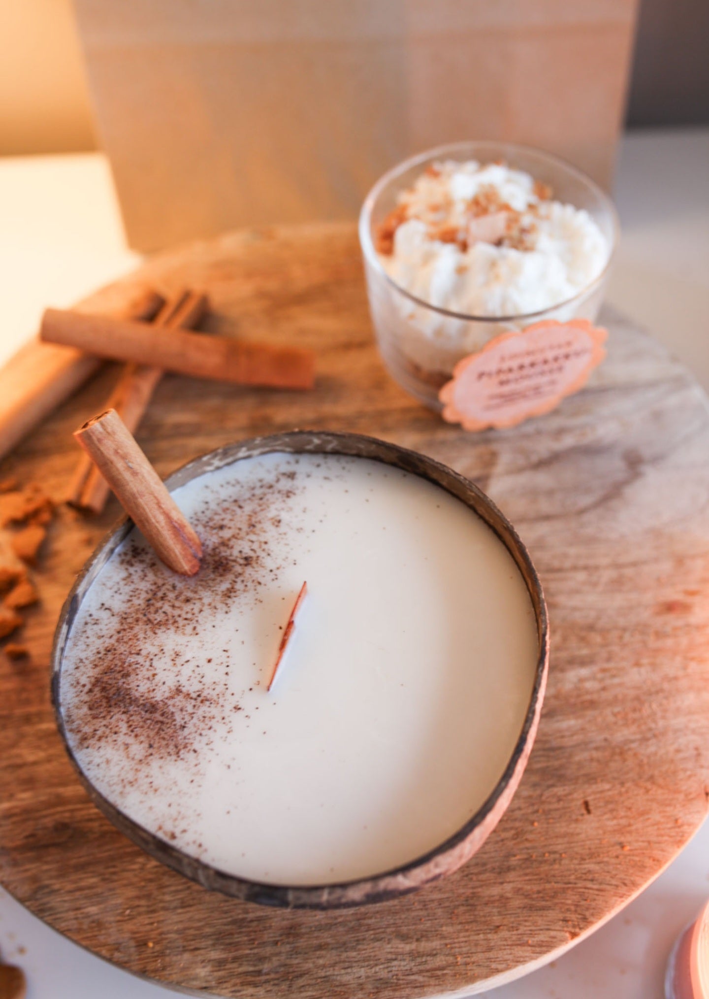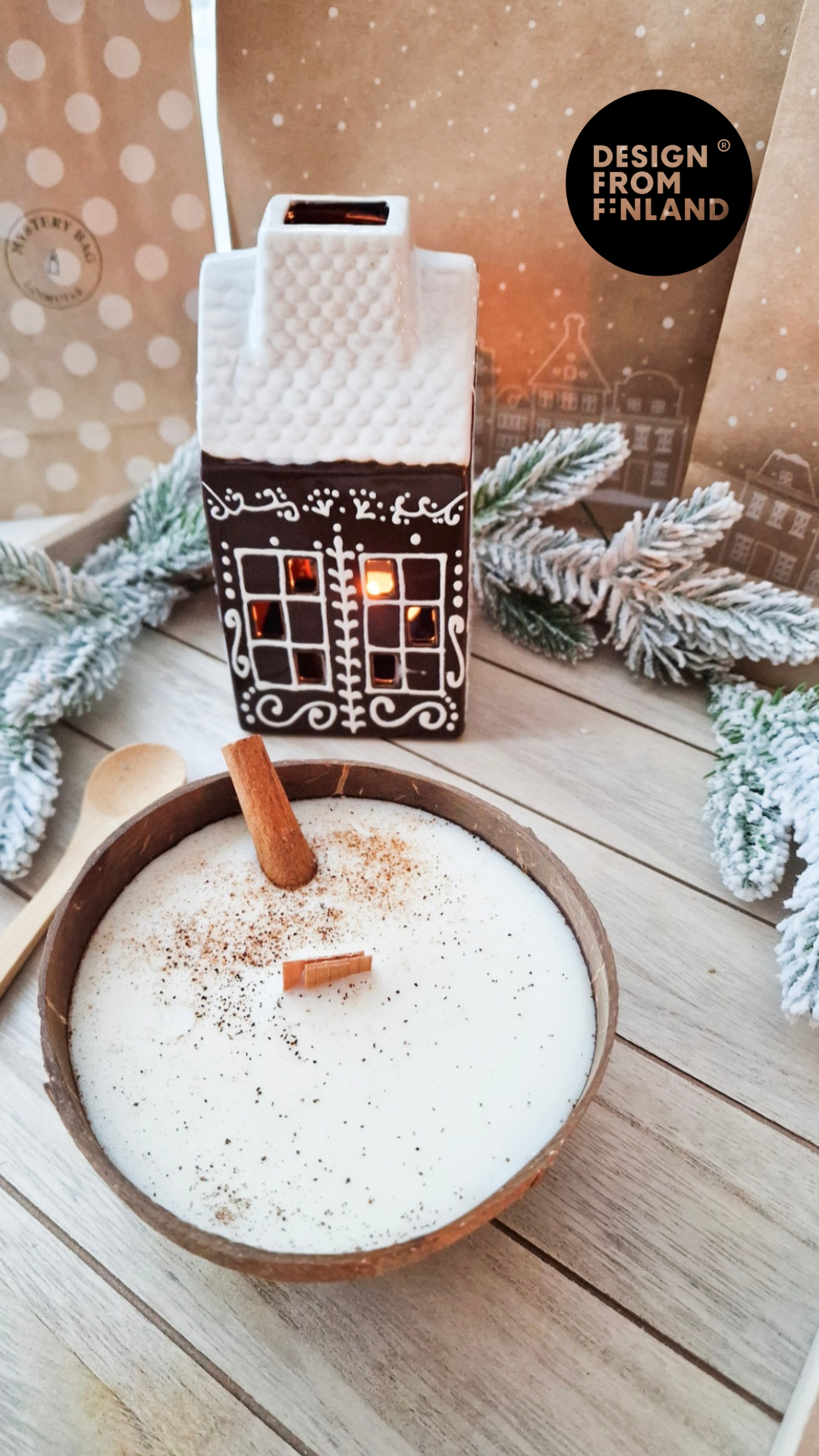 Kynttilä on hajustettu korkealaatuisilla kanelin eteerisillä öljyillä. Kynttilä on valettuna aitoon kookoskuoreen ja koristeltu kanelitangolla ja kanelilla. Puusydän palaa kauniisti rätisten.