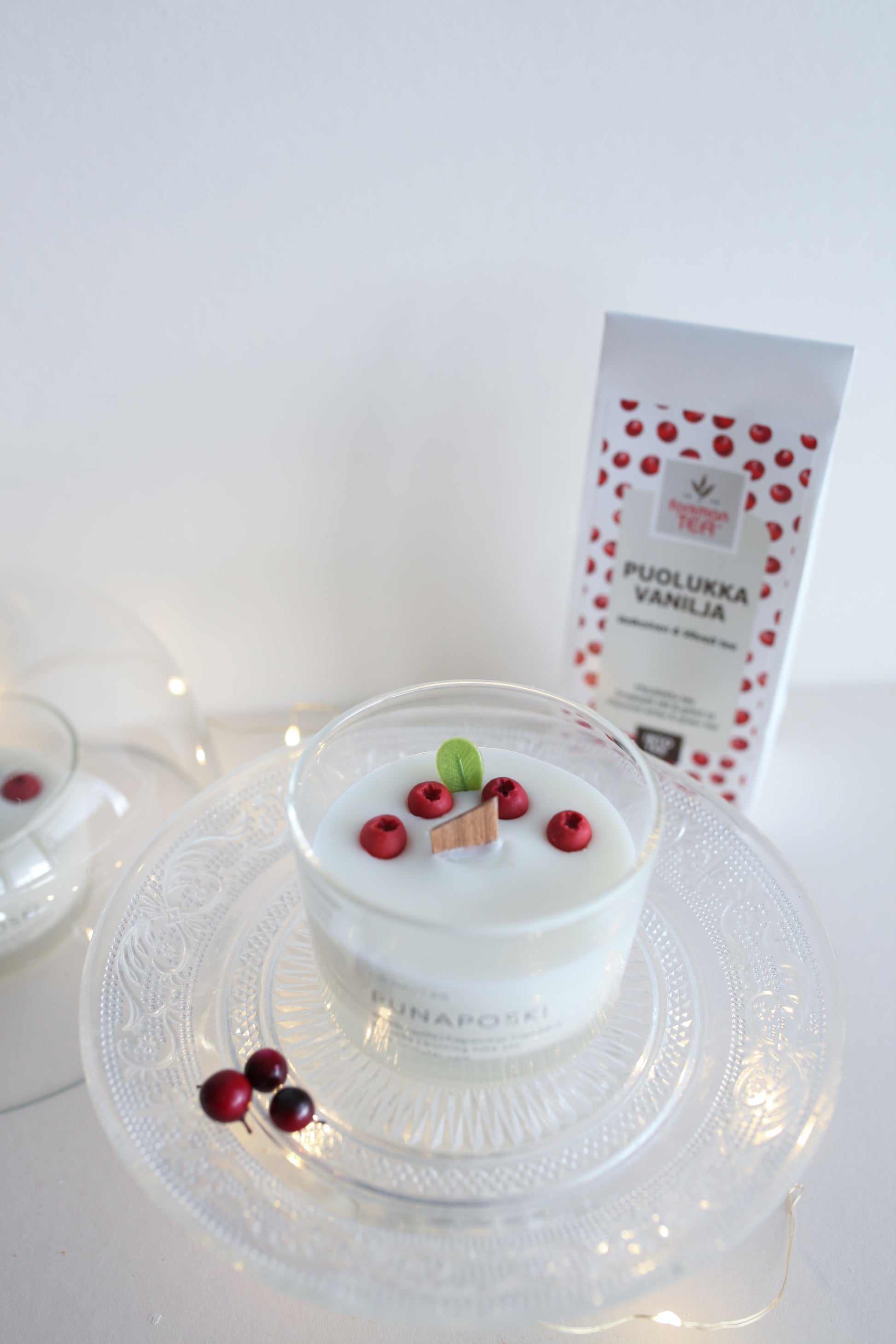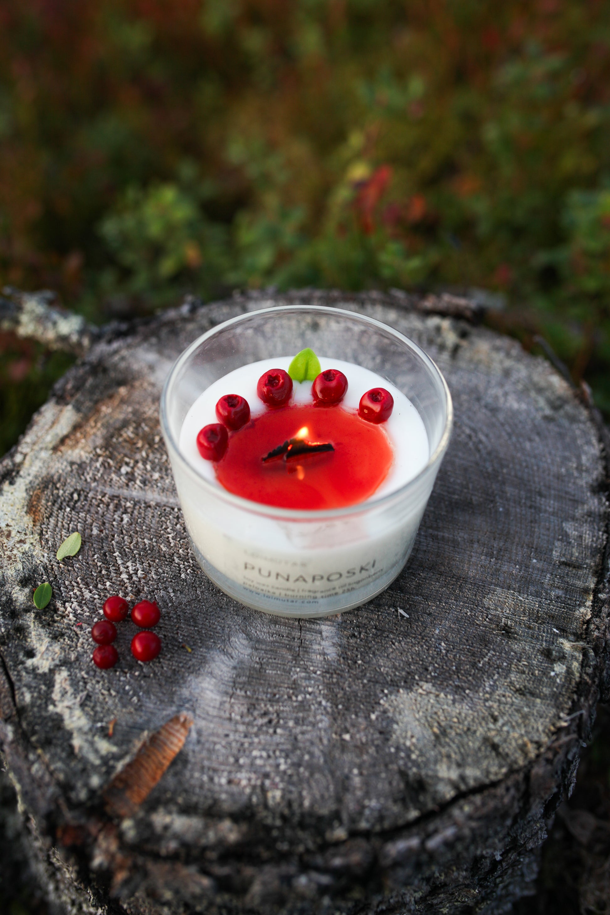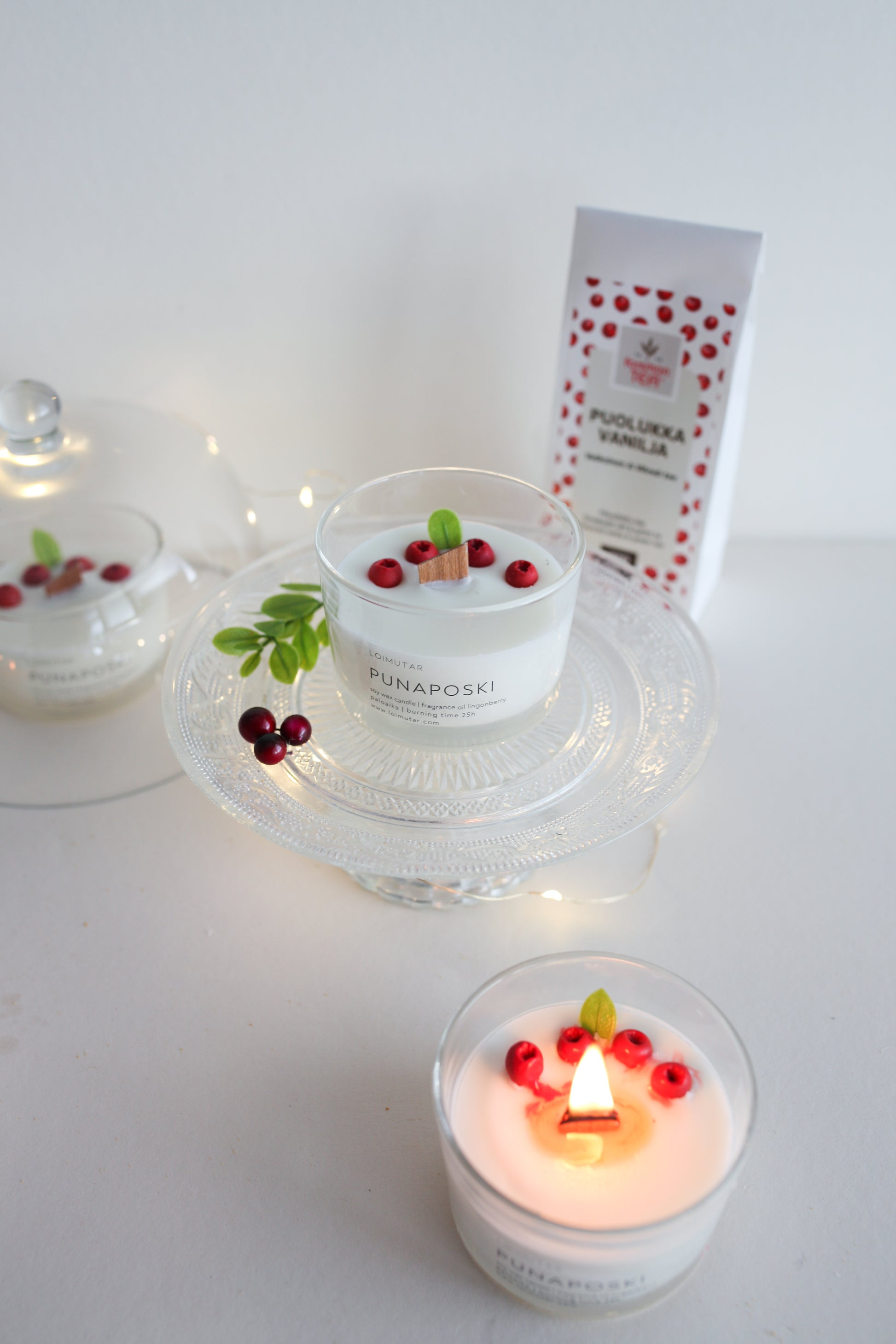 Käsintehtyjen puusydänkynttilöiden tuoteperhe sai uuden perheenjäsenen Punaposkesta! Mustikan, karpalon ja hillan lisäksi pääset nyt tuoksuttelemaan myös iki-ihanaa aidon puolukan tuoksua kynttilässä!