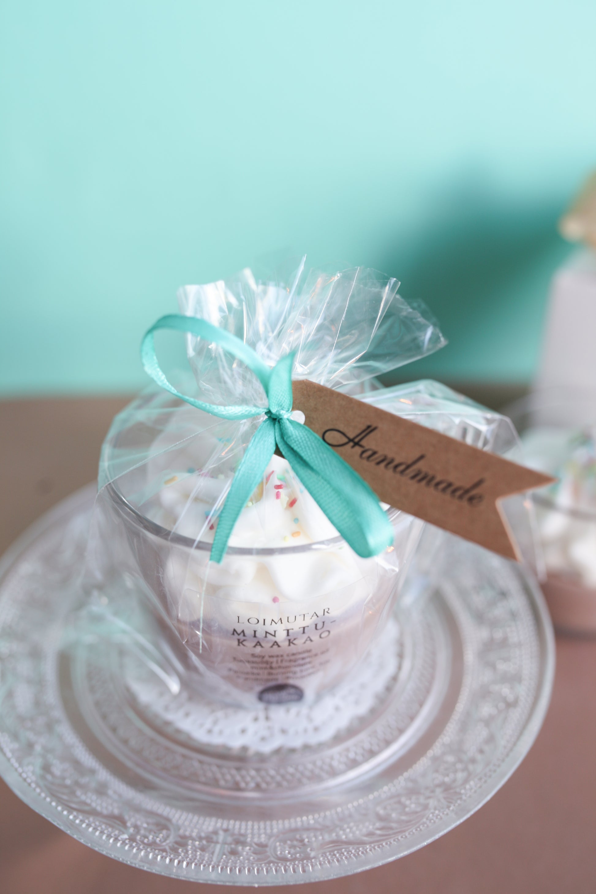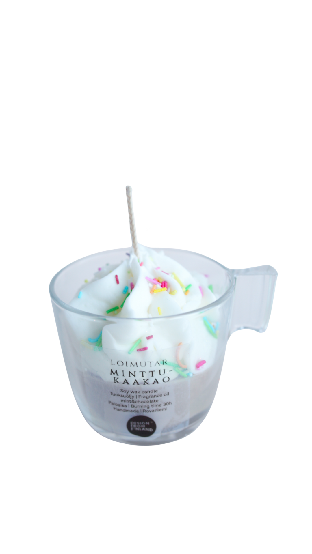 Minttukaakao on lämmönkestävään lasiin valettu tuoksukynttilä. Soija- ja oliivivaha antaa kynttilälle kermaisen pinnan ja pitkän paloajan. Kynttilä palaa rauhallisella liekillä levittäen herkullisen pehmeää maitosuklaan ja minttukaakaon tuoksua ympärilleen. Kynttilän paloaika on noin 30h.