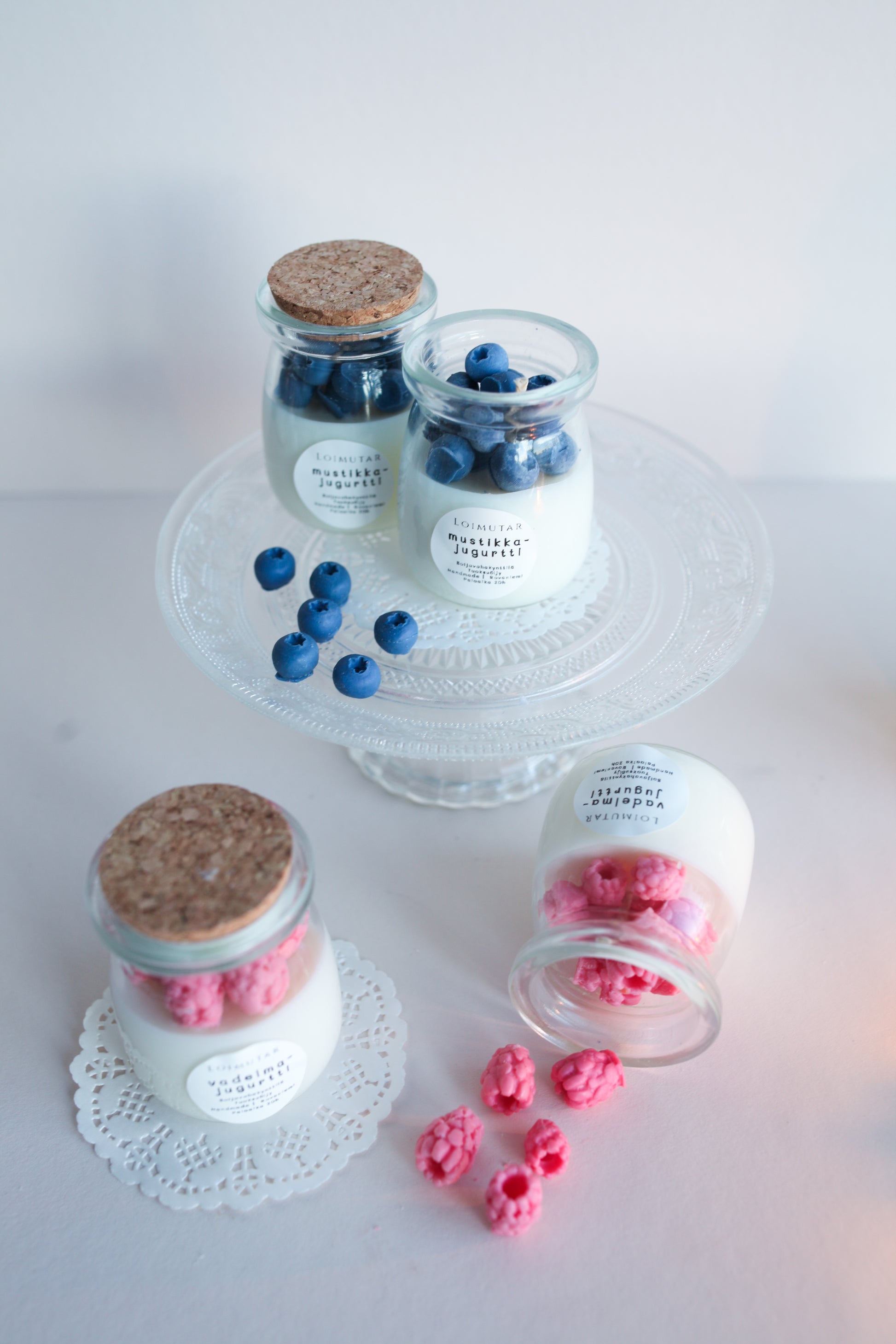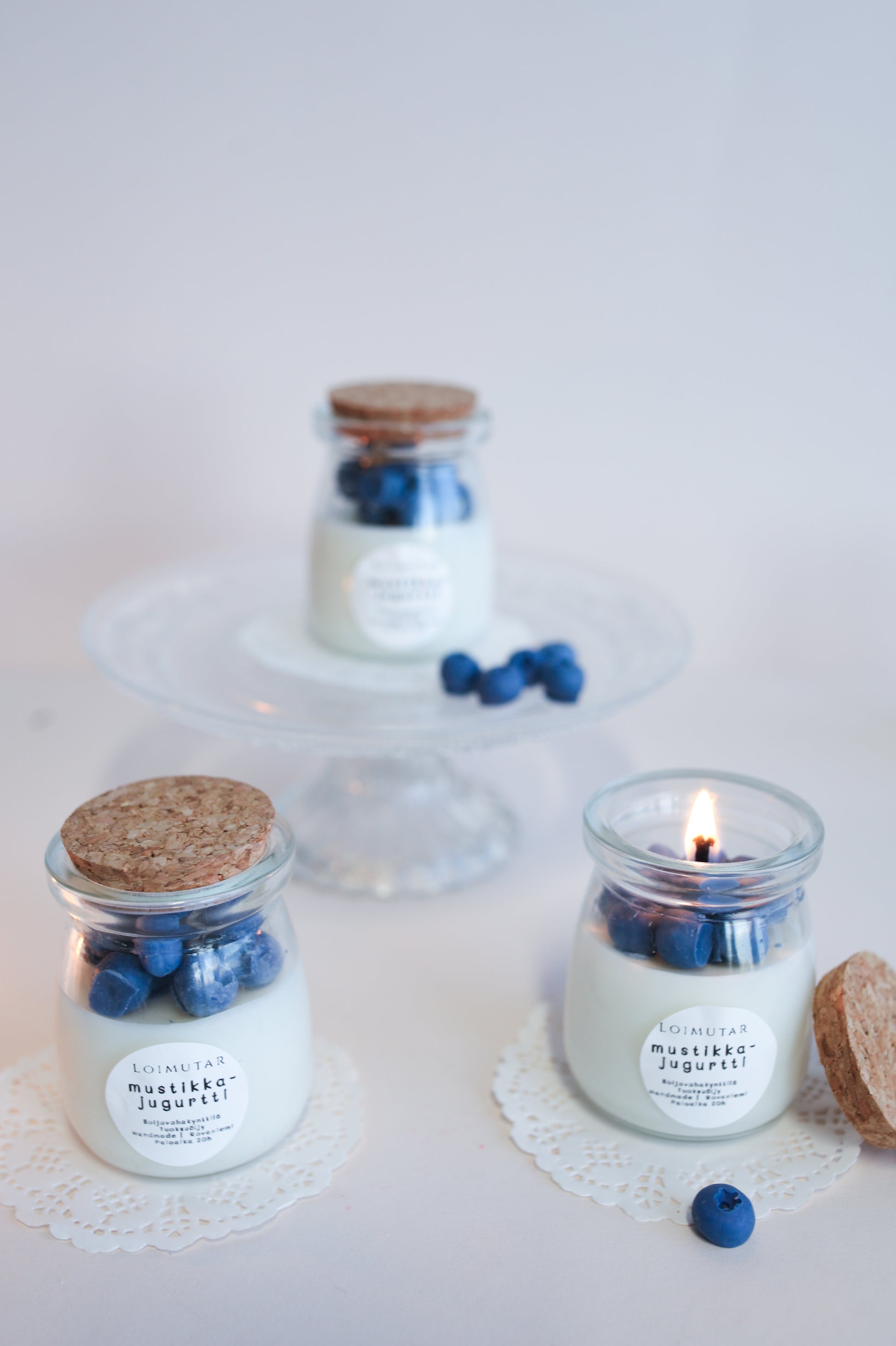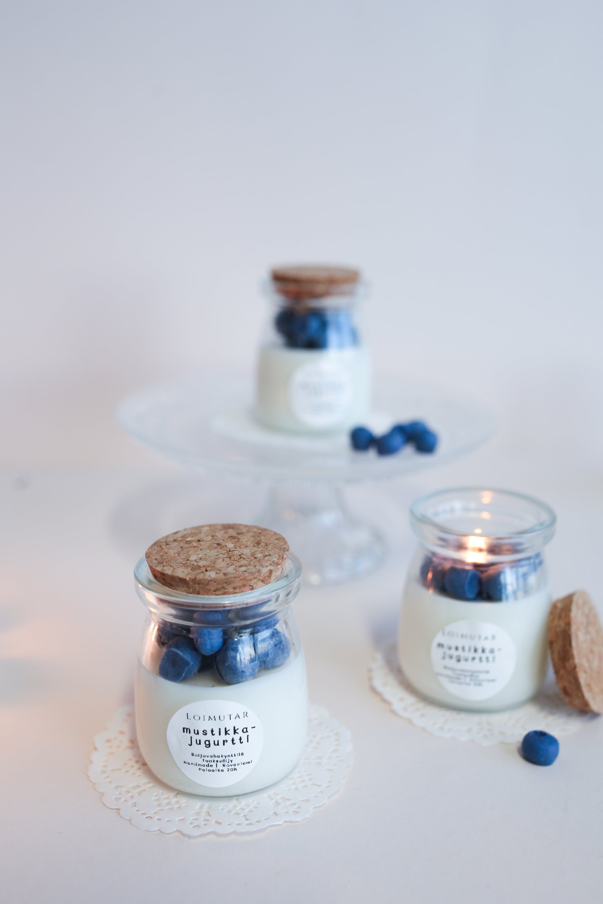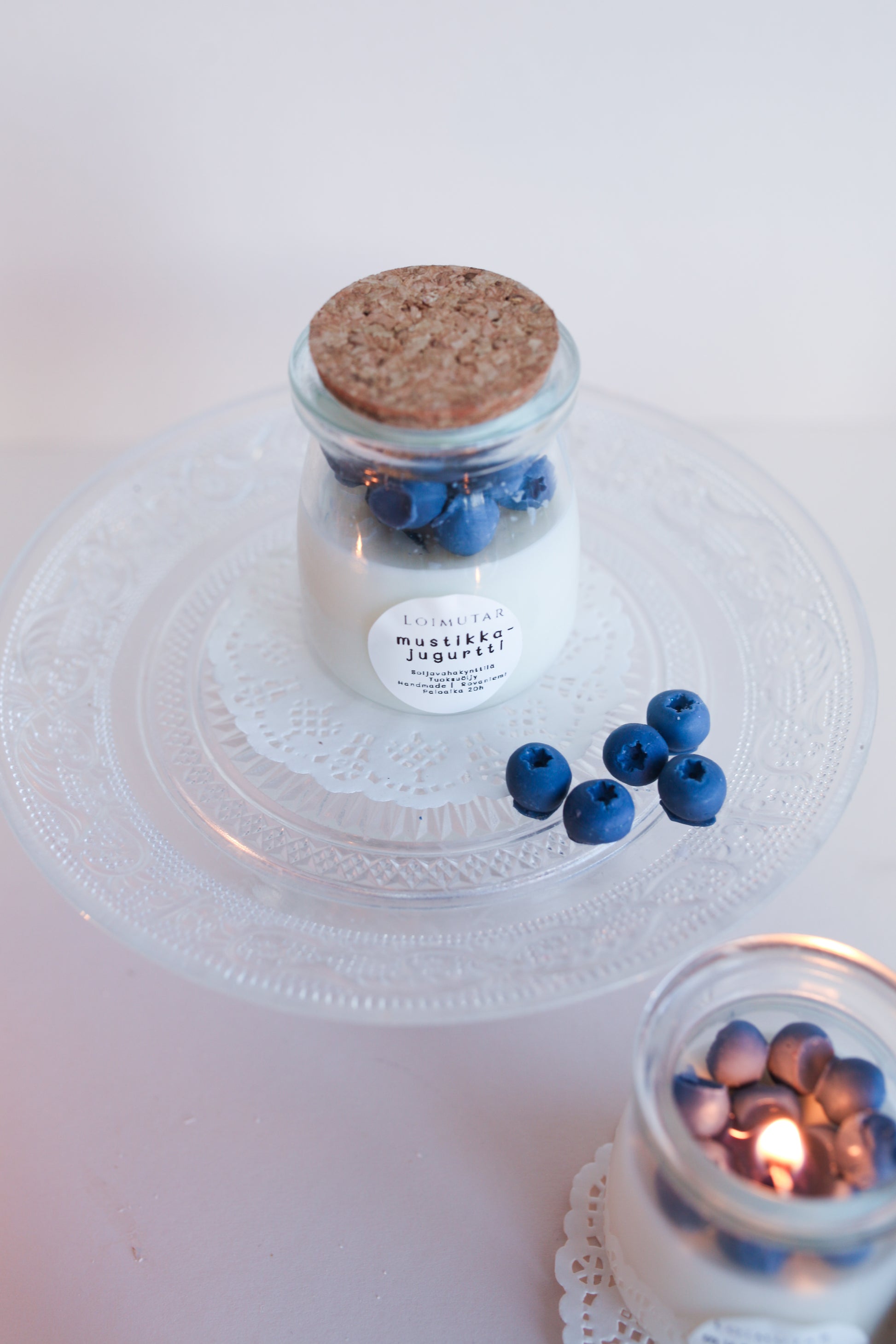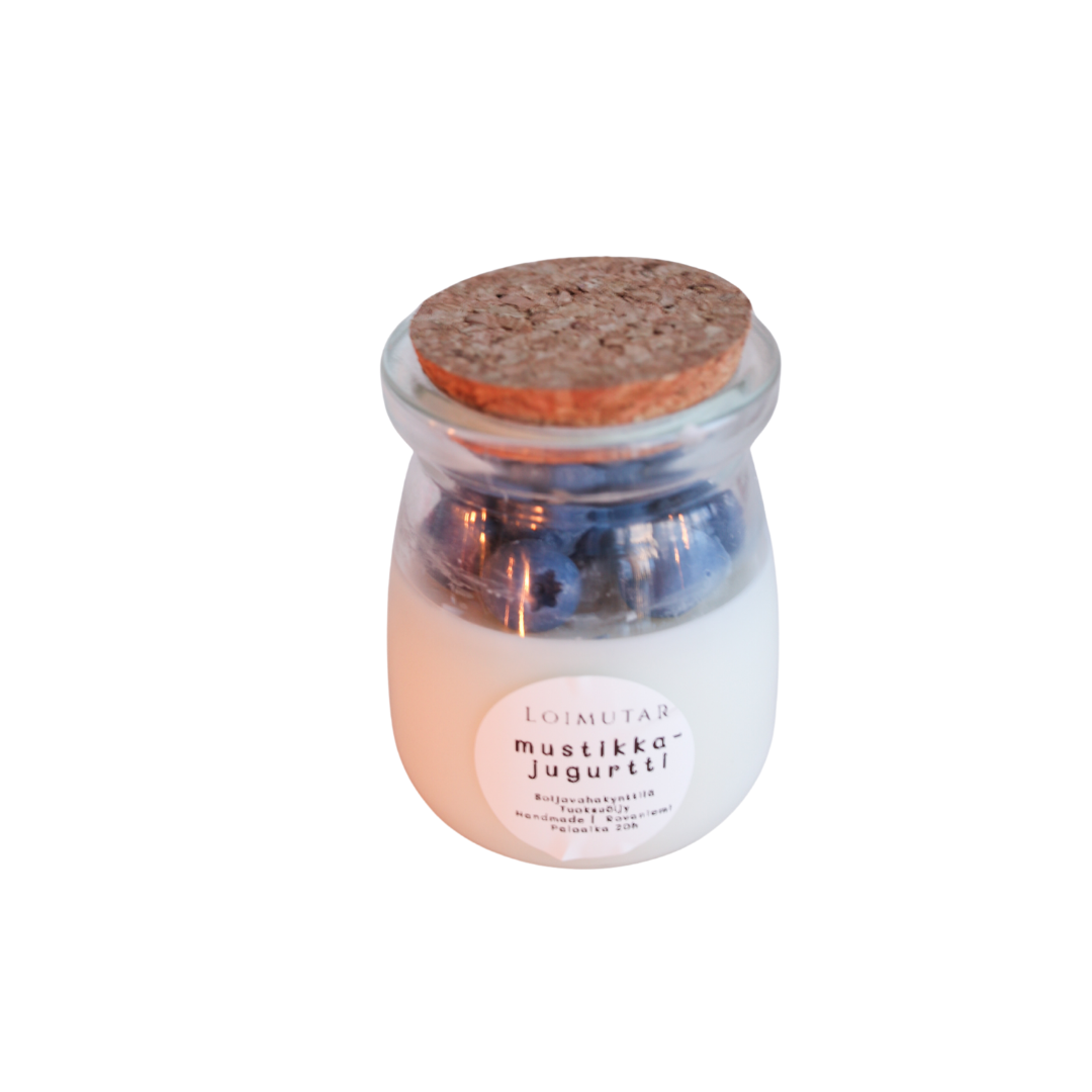 Mini-kerrosjogurtti hurmaa mustikan ja vaniljan tuoksuisena. Korkkikantinen lasikynttilä muistuttaa aitoa luskoitavaa herkkua, jossa on mustikoita ja vaniljajogurttia.