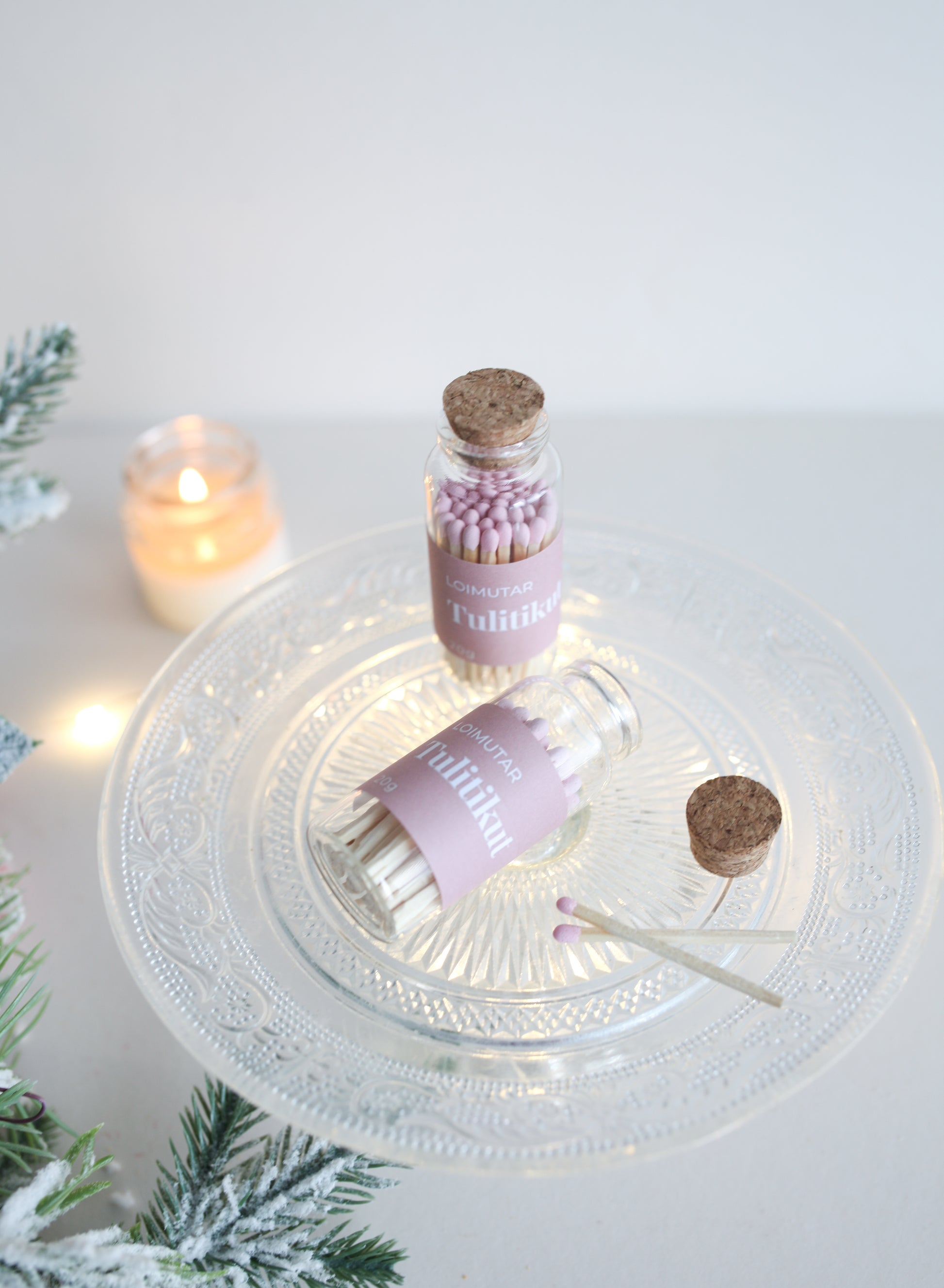 Täydennä kynttilätilaus ihastuttavilla vaaleanpunaisilla tulitikuilla! Loimuttaren vaaleanpunaiset tulitikut lasipullossa sopivat tunnelmalliseen kynttilähetkeen ja ne voi suloisen ulkomuotonsa ansiosta jättää pöydälle kynttilän viereen. Sytytä kynttilä ja anna liekin lumota!