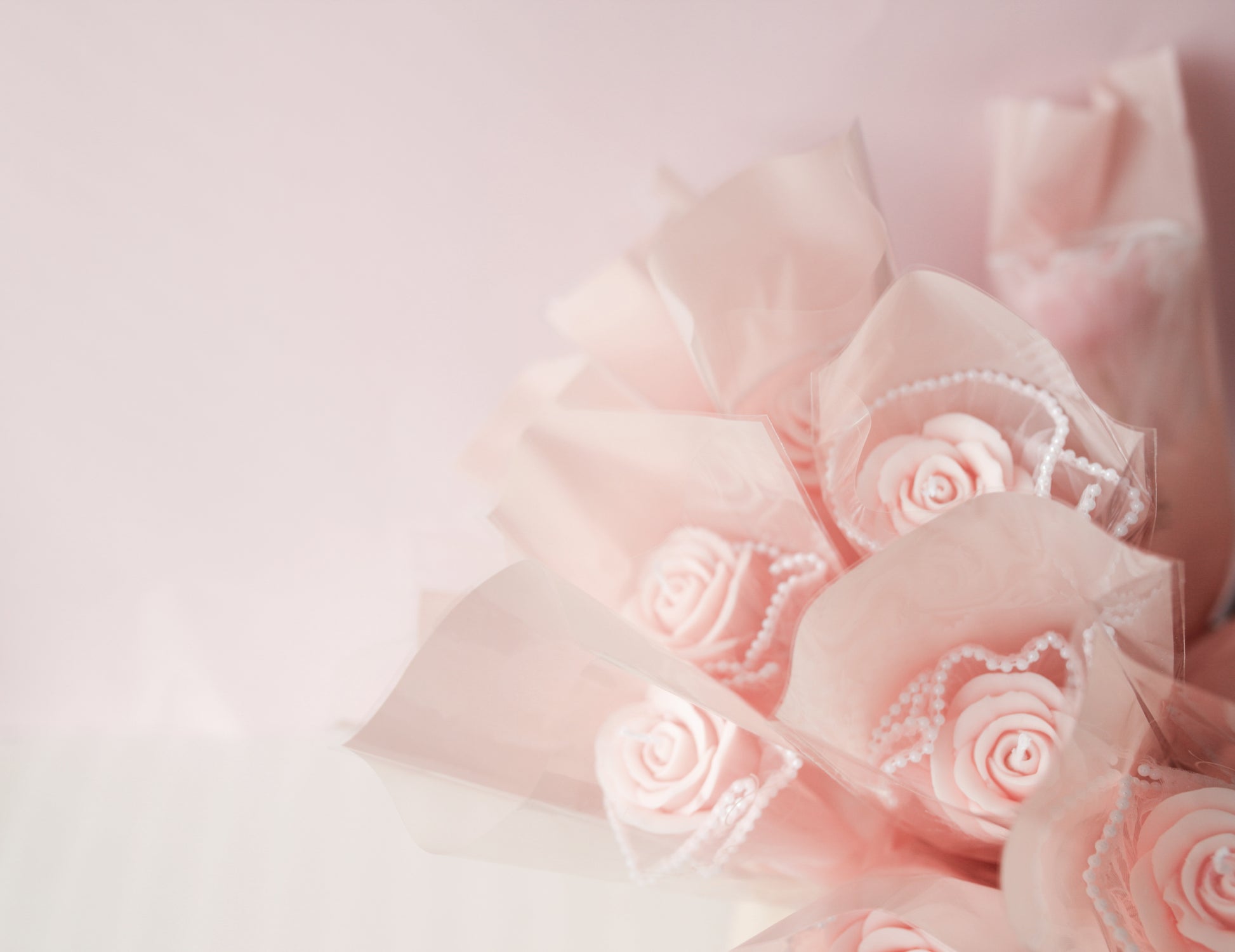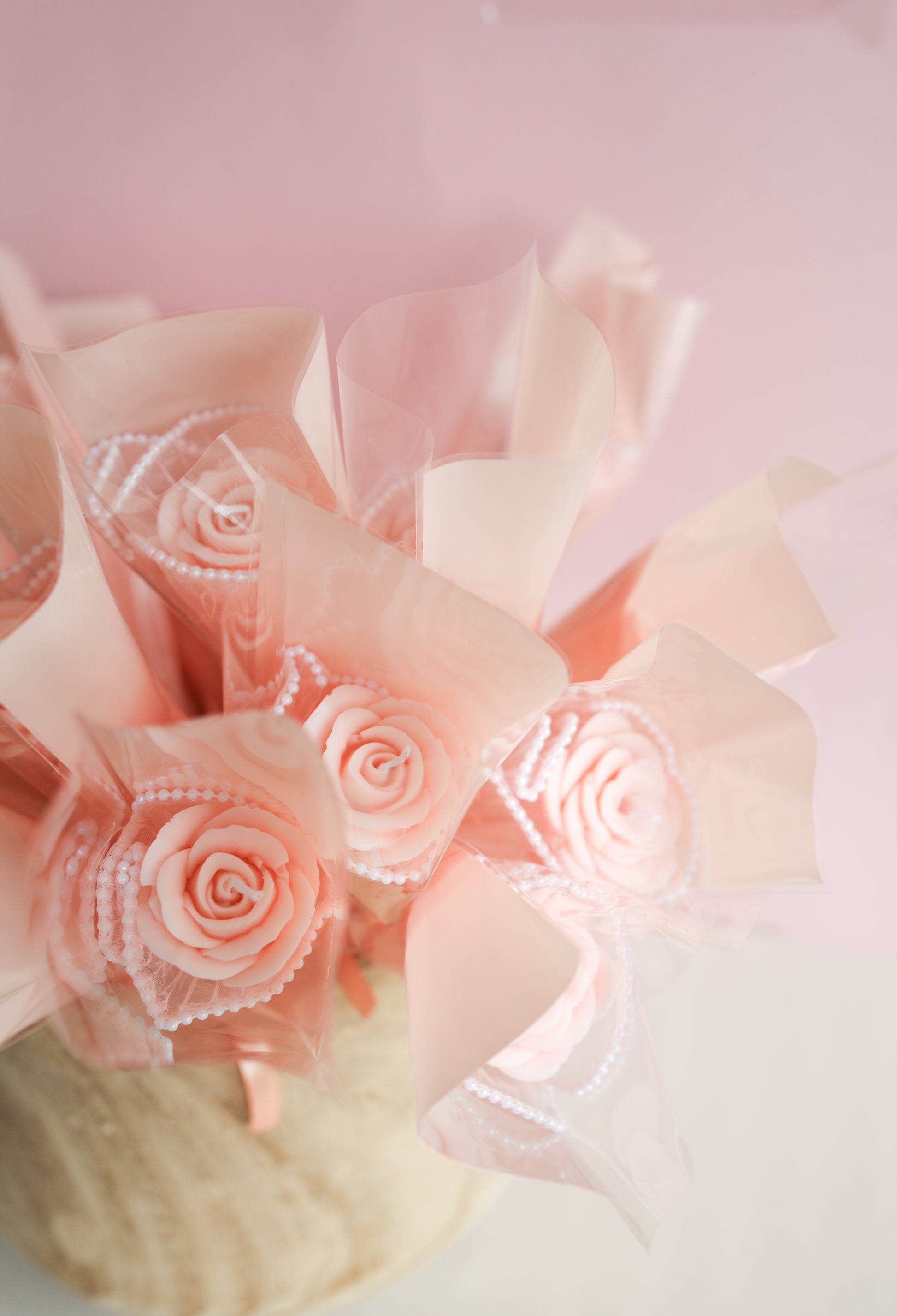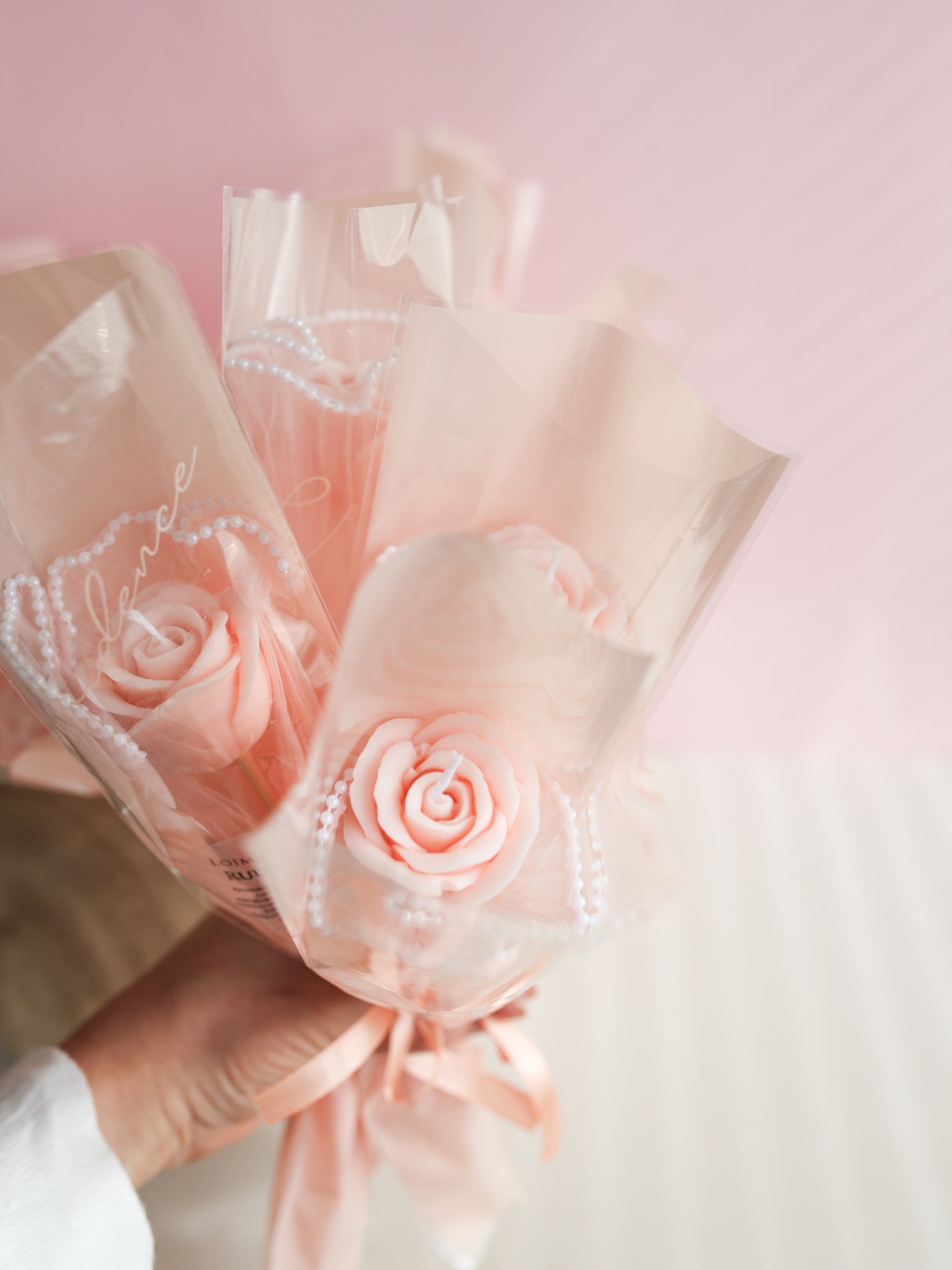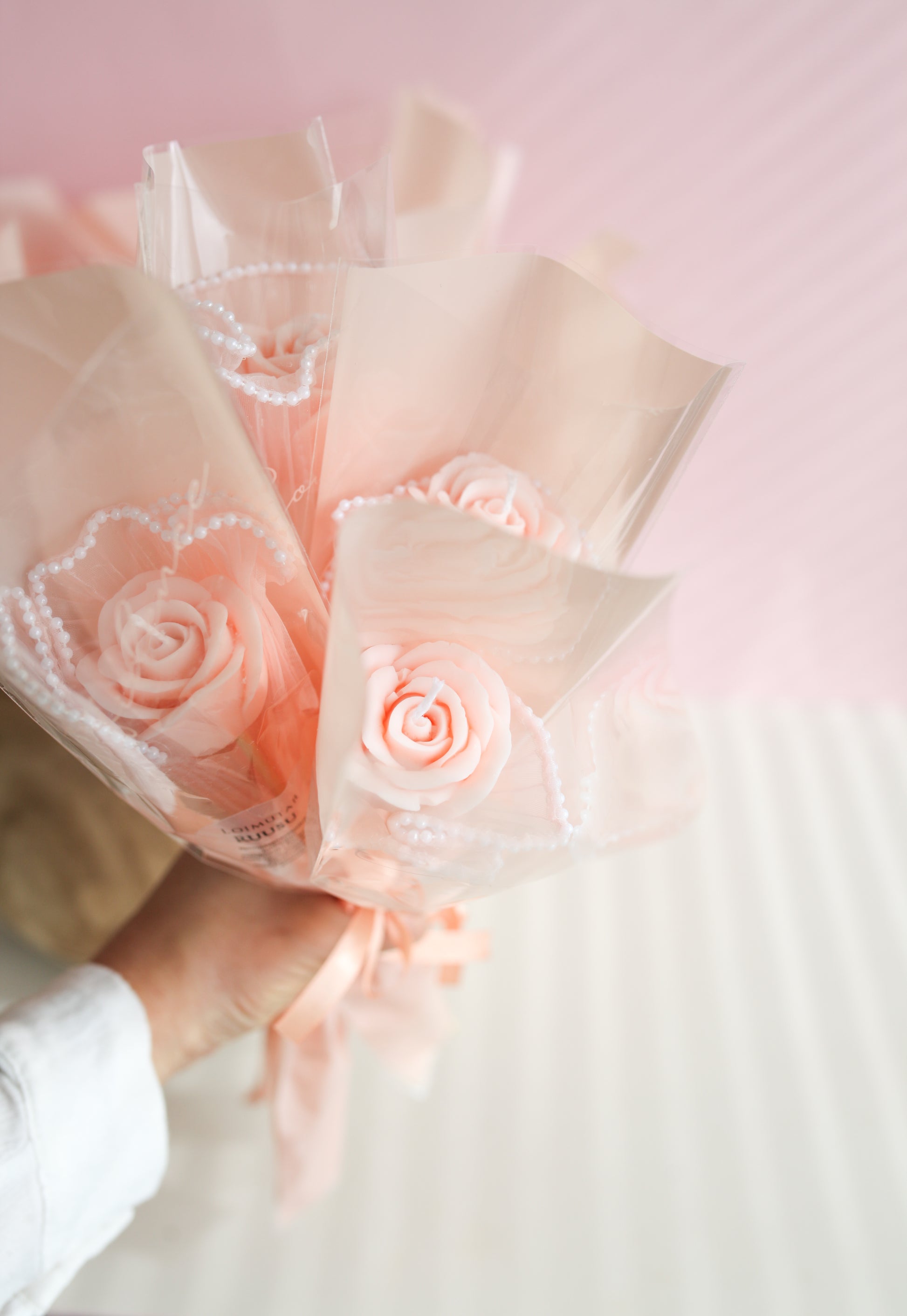 Yksittäispakattu ruusu vaaleanpunaisessa sellofaanikääreessä, jossa helmikoristeita. Ruusun sävy on persikkainen vaaleanpunainen. Viehättävä lahjana ja tuliaisena.♡ Ruusu irrotetaan puuvarresta ja kääreistä ennen polttoa. Valettu käsityönä oliivivahasekoituksesta. Paloaika noin 1-2h. Polta palamattomalla alustalla.