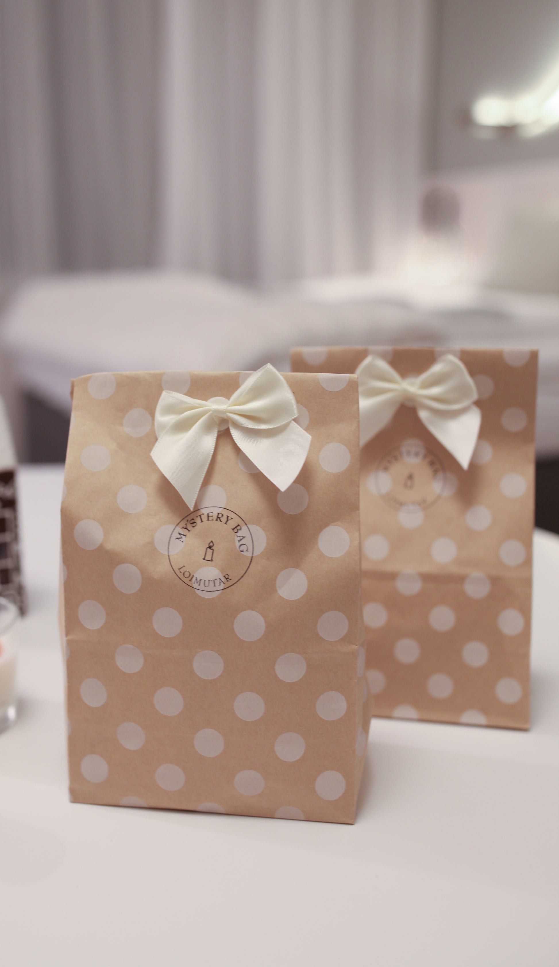 Pilkulliseen paperipussiin pakattu Mystery bag sopii hyvin lahjaksi! Kaunis rusettikoristeinen paperipussi sisältää 3-5 tuotetta, joiden yhteisarvo on noin 25€.